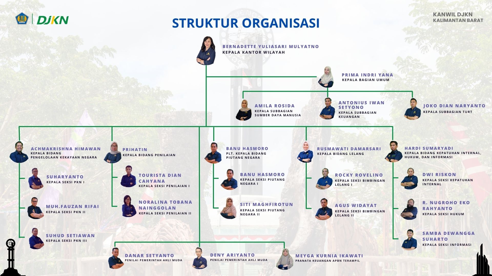 Kanwil DJKN Kalbar dipimpin oleh Kepala Kantor Bernadette Yuliasari Mulyatno dibantu oleh Kepala Bagian Umum Prima Indri Yana; Kepala Bidang Pengelolaan Kekayaan Negara Achmakrishna Himawan; Kepala Bidang Penilaian Prihatin; Plt. Kepala Bidang Piutang Negara Banu Hasmoro; Kepala Bidang Lelang Rusmawati Damarsari; dan Kepala Bidang Kepatuhan Internal, Hukum dan Informasi Hardi Sumaryadi.