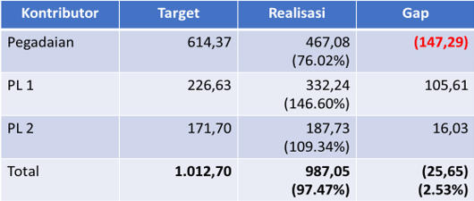 Beruntungnya, tingginya gap pegadaian tersebut dapat diminimalisasi dari besarnya surplus kontribusi Pejabat Lelang Kelas I (PL I), yaitu adanya lelang sukarela penjualan kapal aset anak perusahaan PT. Pertamina (PT. Pertamina International Shipping) yang menghasilkan pokok lelang sebesar Rp. 105 Milyar. Untuk Pejabat Lelang Kelas II (PL II) ada surplus sebesar 16,3 Milyar dan diharapkan kontribusi dari PL II di tahun 2024 perlu ditingkatkan lagi.