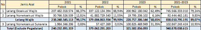 Berdasarkan data diatas, realisasi pokok lelang tahun 2023 didominasi lelang wajib (eksekusi dan non eksekusi), hal ini sangat beresiko tidak dapat terealisasi di tahun 2024. Sedangkan kontribusi lelang sukarela masih sangat rendah. Dari realisasi lelang sukarela tahun 2021 sd 2023, dominasi terbesar dari Badan Usaha Milik Negara (BUMN) yaitu dari anak usaha PT. Pertamina. Masih banyak BUMN yang belum menjadikan lelang dalam pengalihan/pemindahtanganan asetnya. Disamping itu juga, pelaksanaan lelang dari pelaku usaha swasta masih sangat kecil kontribusinya.