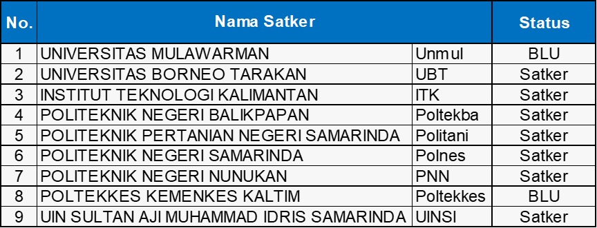 Di wilayah kerja Kanwil DJKN Kalimantan Timur dan Utara terdapat sembilan PTN baik yang berstatus PTN Satker maupun PTN BLU sebagaimana tabel berikut: