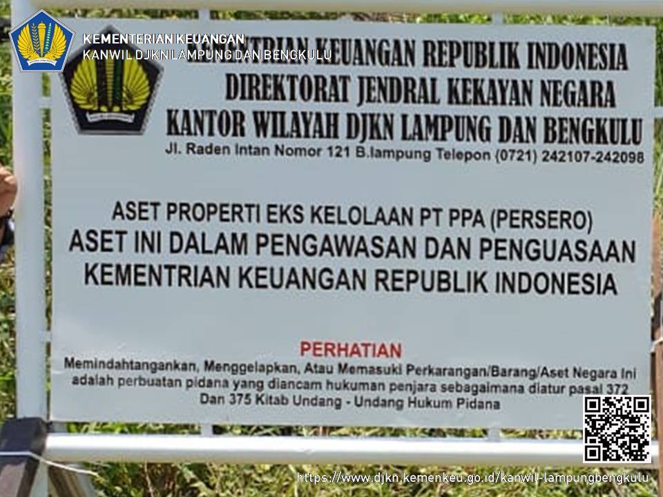 Untuk melakukan pengamanan aset/kekayaan negara yang merupakan bagian dari tugas dan fungsinya sebagai pengelola aset/kekayaan negara, Kanwil DJKN Lamkulu melakukan pemasangan papan nama pengamanan aset properti eks kelolaan PT PPA (Persero) pada tanggal 24 September 2020. Ada pun aset properti yang dipasang papan nama pengamanan kali ini adalah berupa tanah dengan luas kurang lebih 7.000 m2, berkontur lembah/berbukit, dan dengan peruntukan sebagai kawasan industri.