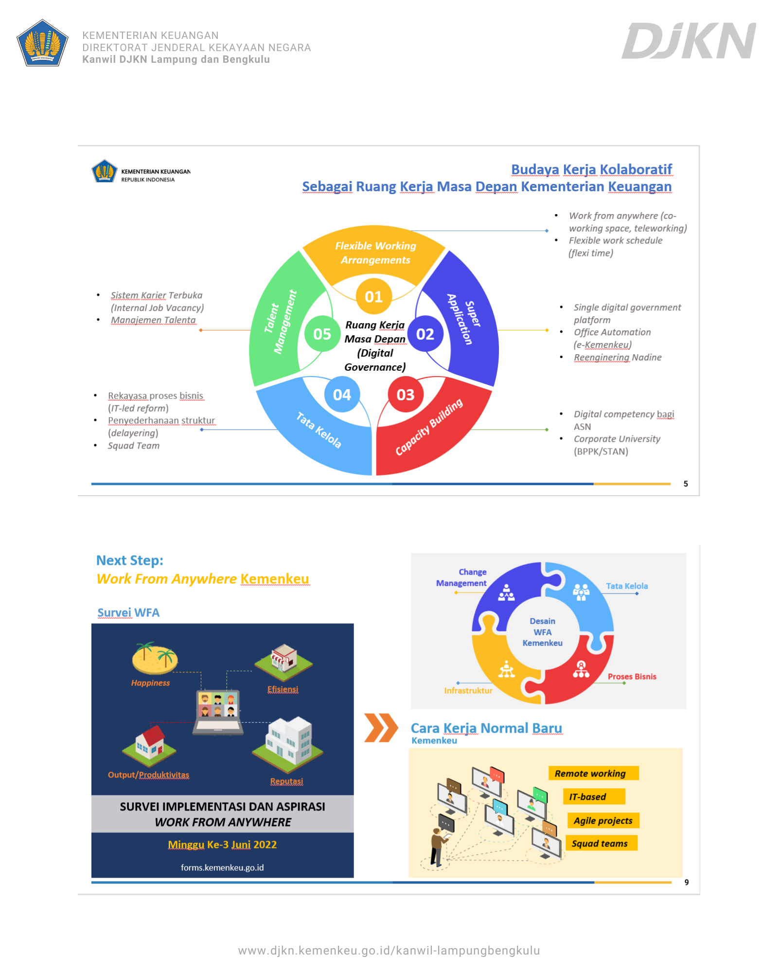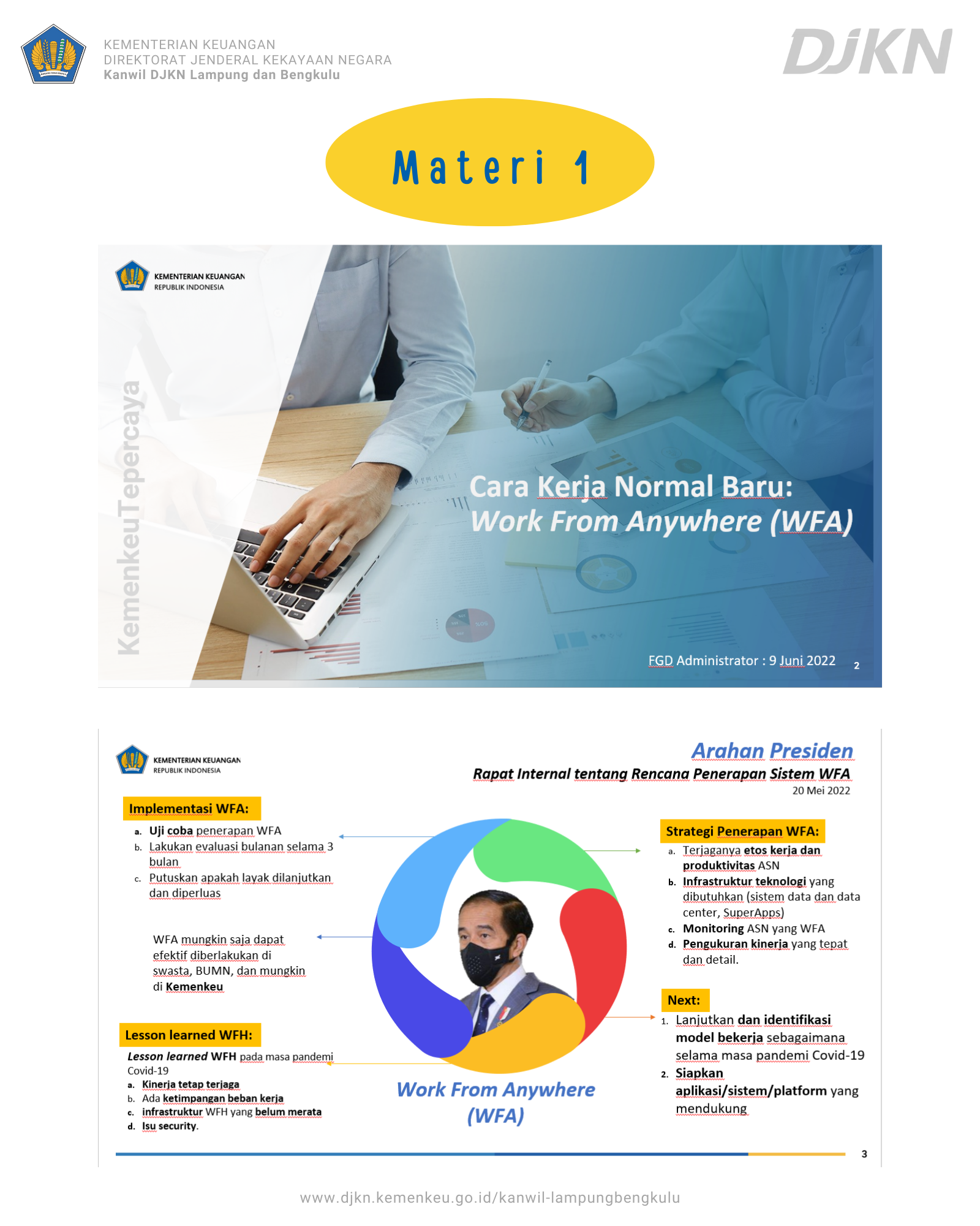 yaitu: Cara Kerja Normal Baru: Work From Anywhere (WFA) dan Sistem dan Budaya Kerja Normal Baru Kemenkeu.