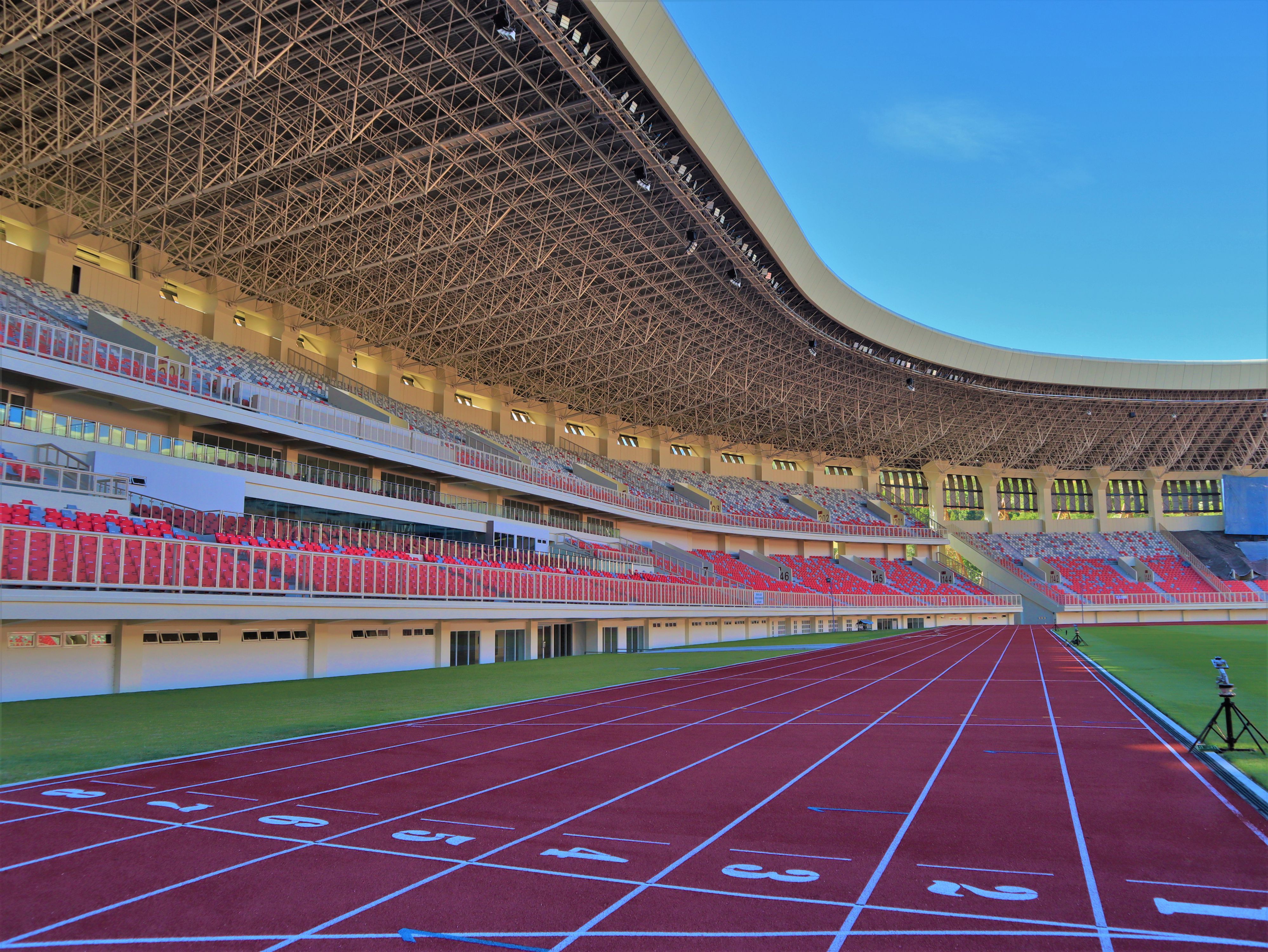 dilengkapi dengan trek lintasan atletik sintetis berstandar Asosiasi Federasi Atletik Internasional (IAAF) yang dikerjakan oleh tenaga ahli dari