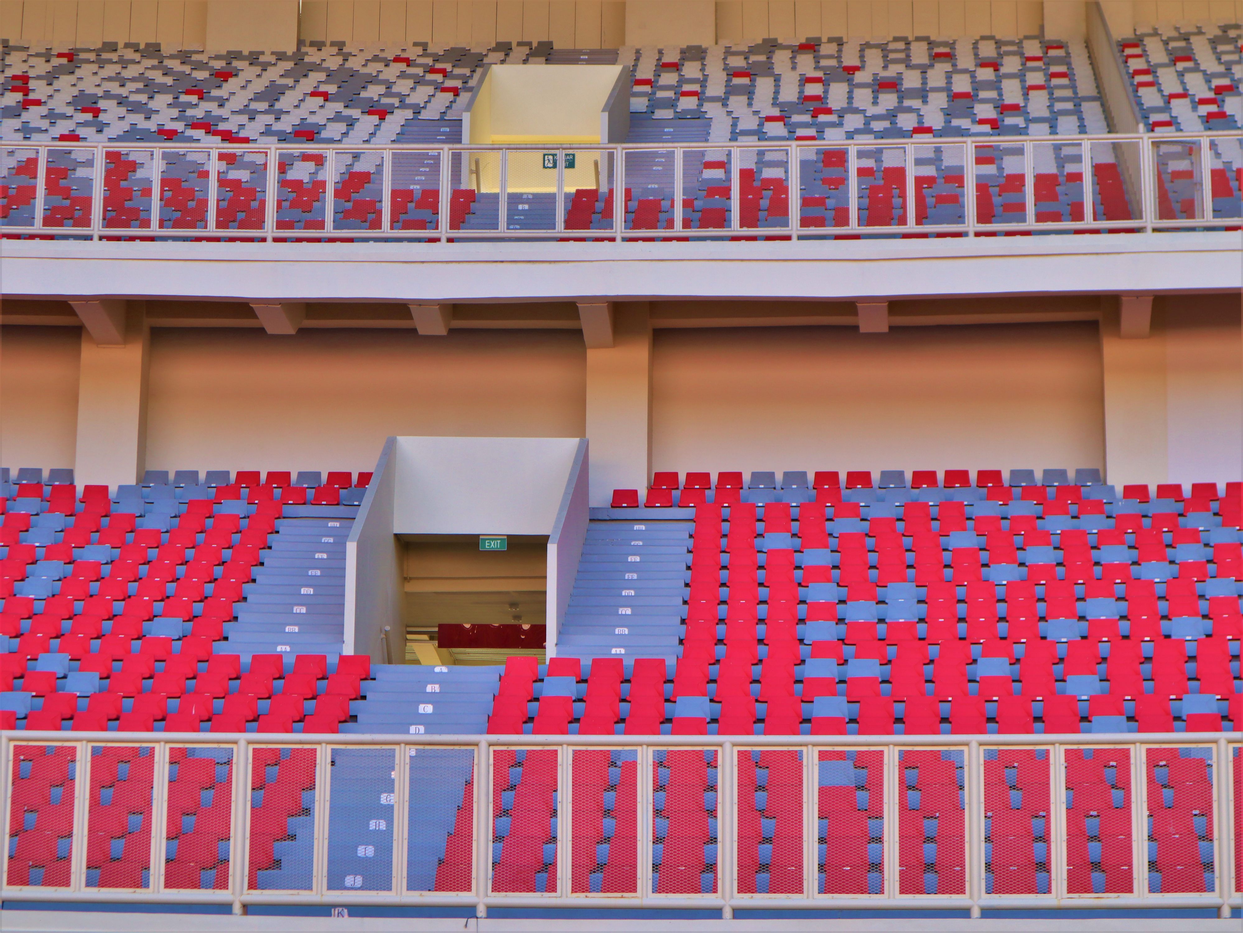 stadion, kita langsung disuguhkan perpaduan warna abu-abu, merah, dan putih