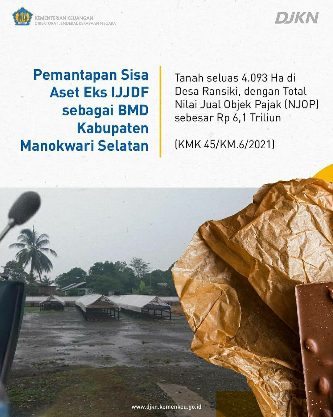 Senin (12/4), seluas 4.093 Ha aset eks Yayasan Kerjasama Untuk Pembangunan Irian Jaya (The Irian Jaya Joint Development Foundation/IJJDF) diserahkelolakan kepada Pemerintah Daerah Kabupaten Monokwari Selatan dan ditetapkan menjadi Barang Milik Daerah.