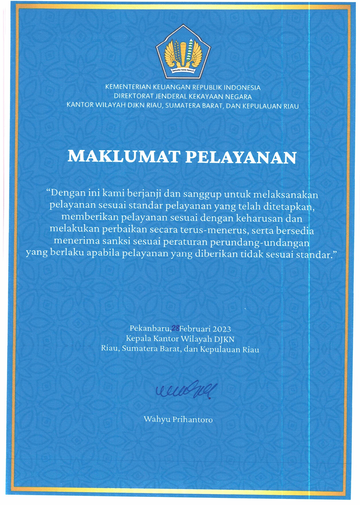 Maklumat Pelayanan Kanwil DJKN Riau, Sumatera Barat dan Kepulauan Riau