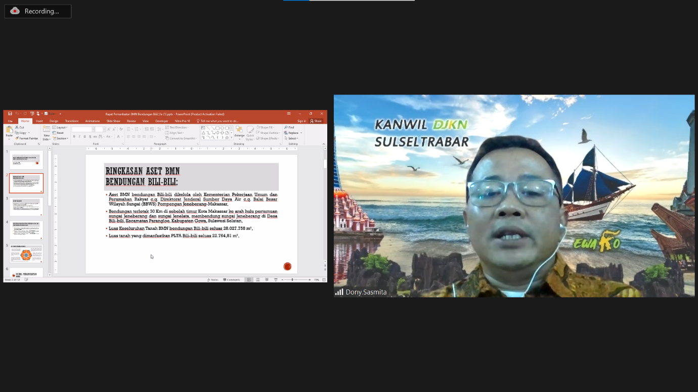Pembahasan pemanfaatan aset yang dilakukan melalui media dalam jaringan (daring) pada Jum’at (06/08) tersebut dihadiri pihak dari Kanwil DJKN Sulseltrabar sebagai pengelola aset, pihak BBWS Pompengan-Jeneberang sebagai pengguna, serta pihak terkait PLTA Bili-Bili pada. Acara dibuka oleh Kepala Bidang Pengelolaan Kekayaan Negara (PKN), Desak Putu Jeny mewakili Kepala Kanwil DJKN Sulseltrabar. Dalam pembukaanya, Jeny menjelaskan tujuan dari kegiatan tersebut adalah untuk melakukan pembahasan penataan pemanfaatan aset BMN di bendungan Bili-Bili. “Bendungan Bili-Bili adalah salah satu aset BMN yang digunakan oleh BBWS di bawah Kementerian PUPR. Pada saat kami melakukan peninjauan ke sana kami melihat bahwa bendungan Bili-Bili ini salah satu sudutnya digunakan oleh PLN sebagai PLTA”.