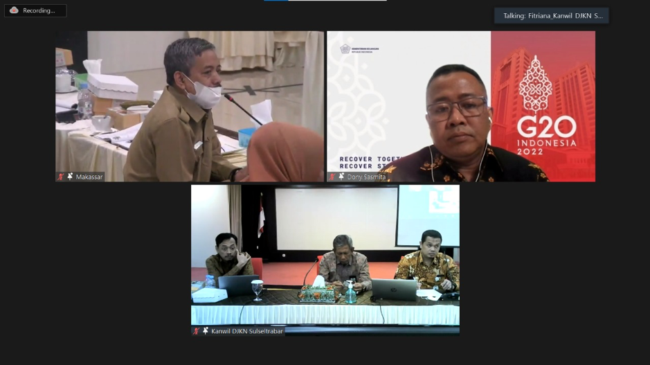 Makassar – Kanwil DJKN Sulawesi Selatan, Tenggara dan Barat menyelenggarakan sosialisasi permohonan penilaian online dan mekanisme kerjasama pemanfaatan Barang Milik Daerah (BMD) secara hybrid pada Selasa (28/06) di Aula A’Bulo Sibatang Lantai 5 Gedung Keuangan Negara II Makassar dan melalui aplikasi rapat online. Kegiatan tersebut dihadiri oleh Kepala Badan Keuangan dan Aset Daerah Provinsi Sulawesi Selatan, perwakilan Badan Pengelola Keuangan dan Aset Daerah Provinsi Sulawesi Tenggara, Badan Pengelola Keuangan dan Pendapatan Daerah Provinsi Sulawesi Barat dan jajaran masing-masing serta pejabat administrator, pejabat pengawas dan pejabat fungsional Kanwil DJKN Sulseltrabar. Acara menghadirkan narasumber Penilai Pemerintah Ahli Madya, Murtadji, Kepala Seksi Penilaian I, Iling Saidah, Kepala Seksi Pengelolaan Kekayaan Negara I, Dony Sasmita.