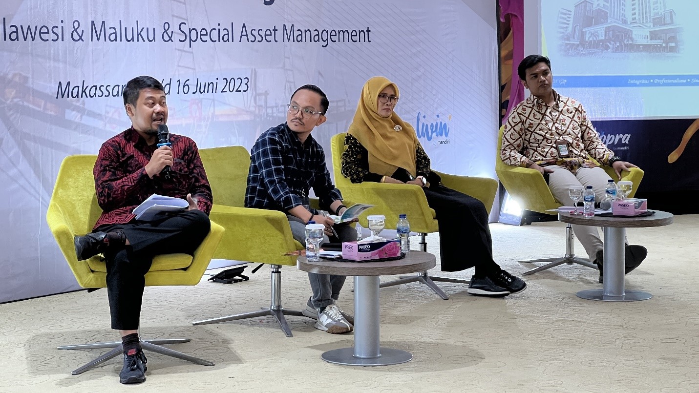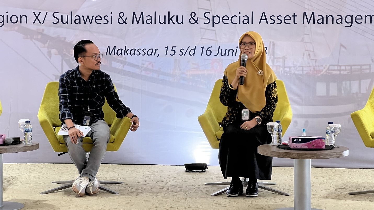 Kepala Bidang Lelang, Chairiah, Kepala Seksi Bimbingan Lelang II, Teguh Kuncoro dan Pelelang Ahli Muda KPKNL Makassar Dimar Novensastomo menjadi narasumber untuk memberikan sharing session terkait pelaksanaan lelang hak tanggungan dan hak tagih dalam penyelesaian kredit bermasalah serta materi mengenai masa insolvensi dan hak eksekusi kreditor separatis dalam kepailitan.