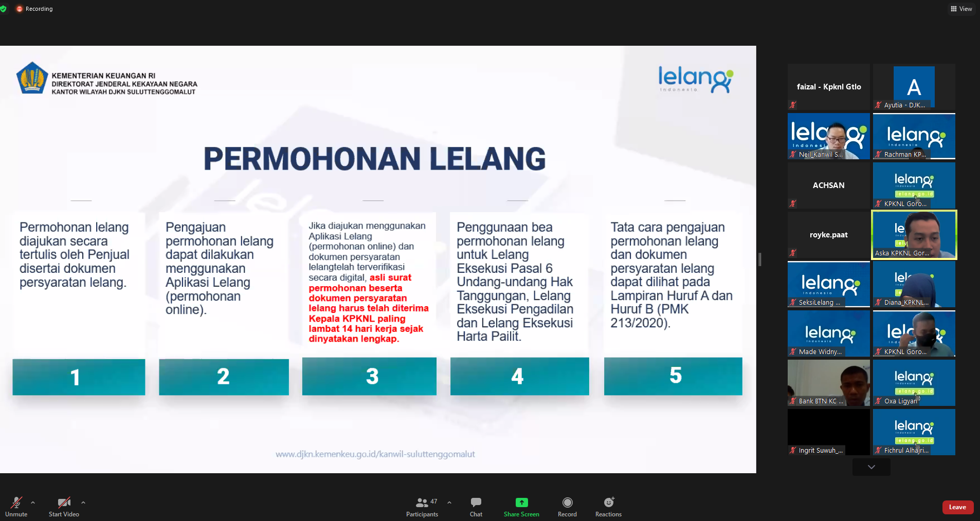 Guna memberikan pemahaman terkait PMK tersebut kepada para mitra lelang, Kepala Bidang Lelang Kantor Wilayah Direktorat Jenderal Kekayaan Negara Sulawesi Utara, Tengah, Gorontalo, dan Maluku Utara (Kanwil DJKN Suluttenggomalut) Neil Efryano Prayoga menyosialisasikan hasil simplifikasi petunjuk pelaksanaan lelang kepada para mitra lelang Kantor Pelayanan Kekayaan Negara dan Lelang (KPKNL) Gorontalo, terutama perbankan dalam melakukan permohonan dan pelaksanaan lelang eksekusi Hak Tanggungan.