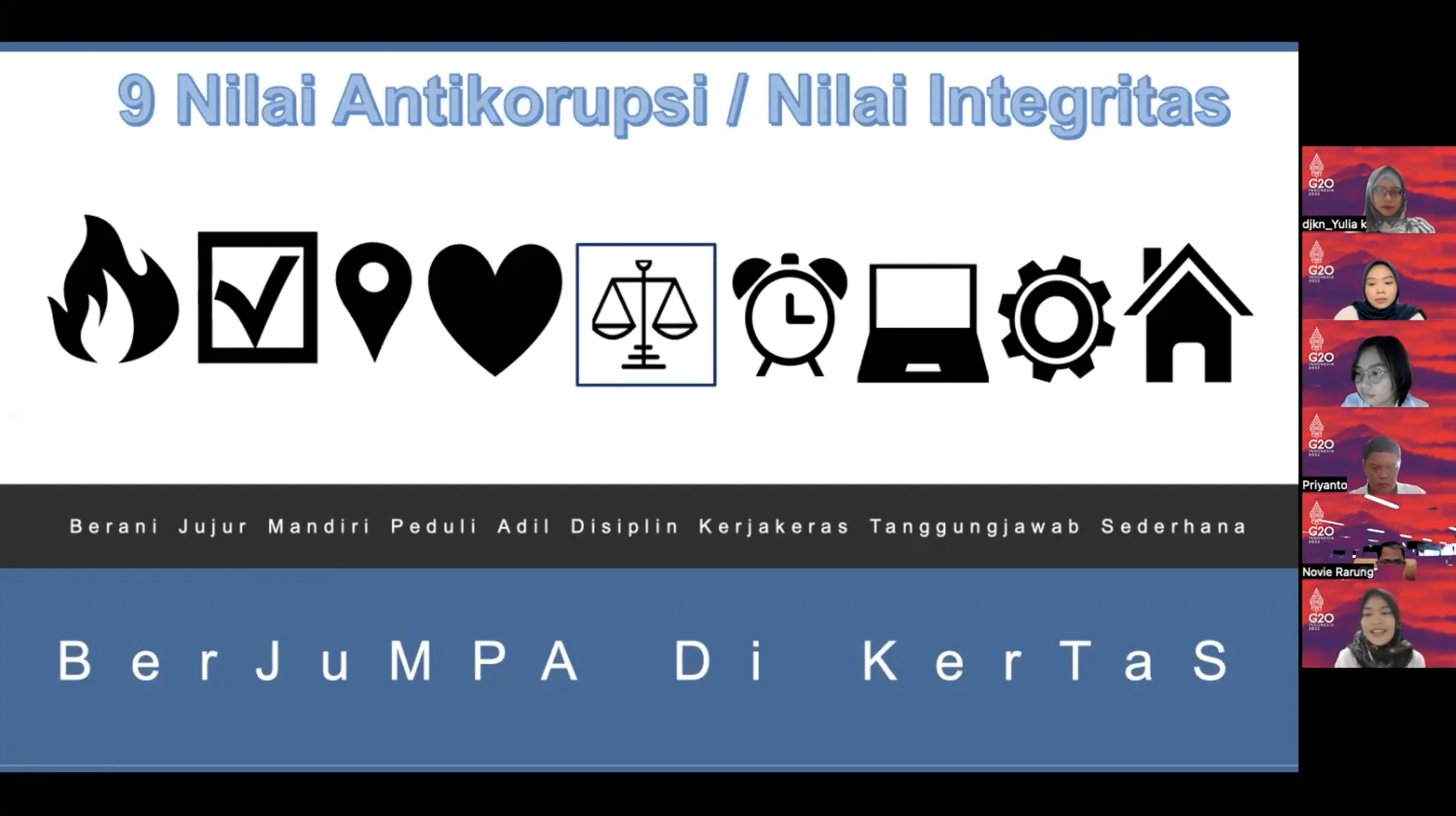Dalam kesempatan tersebut, Athika memaparkan kesembilan nilai antikorupsi beserta contoh penerapannya, diantaranya: