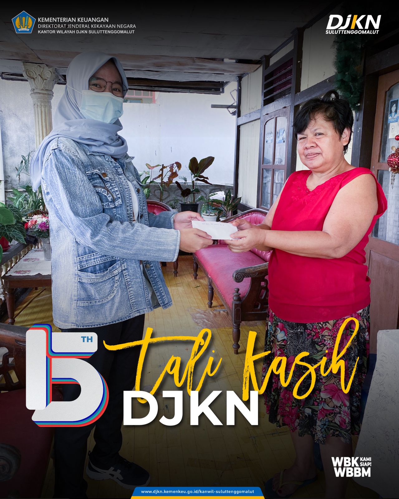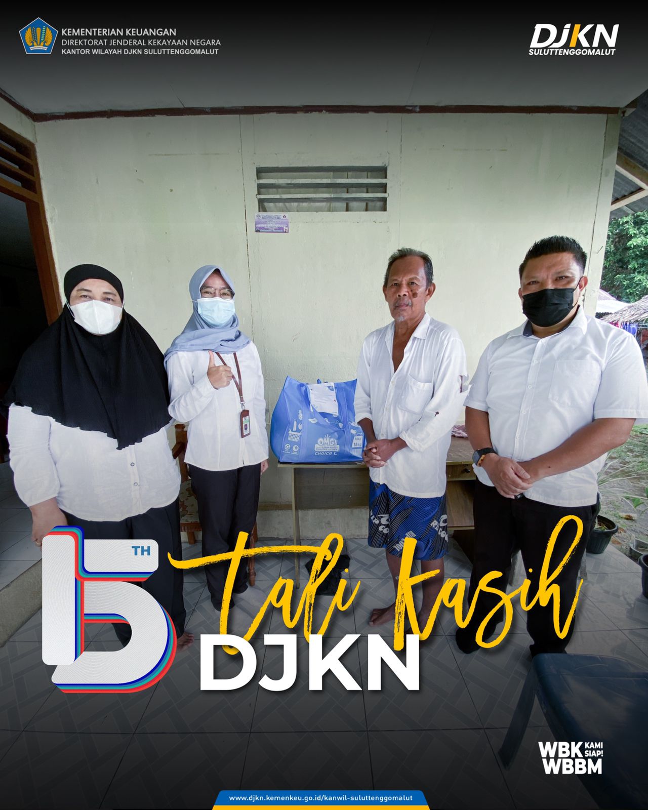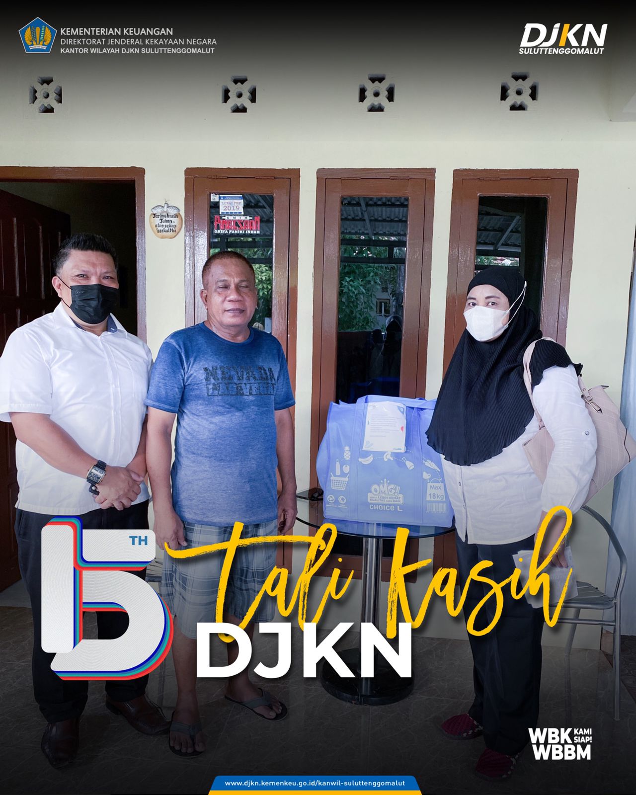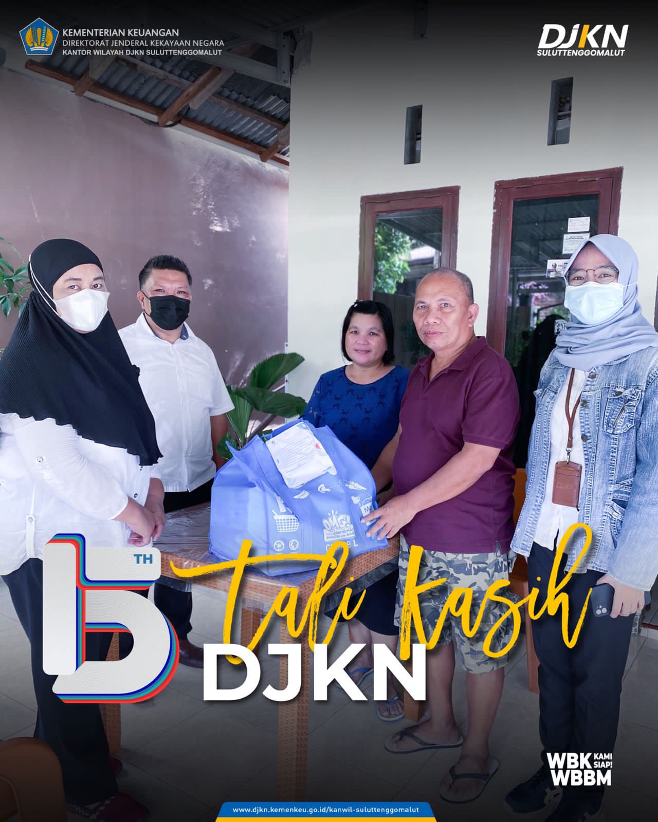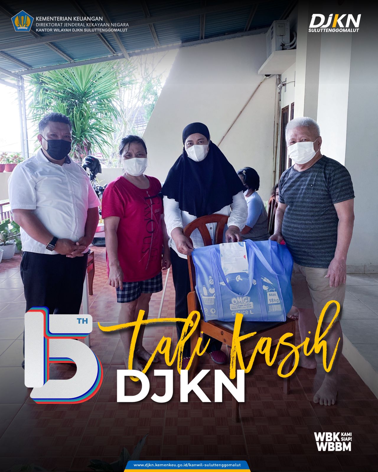 Manado - Senin (8/11) Dalam rangka peringatan HUT DJKN ke-15 Kantor Wilayah Direktorat Jenderal Kekayaan Negara Sulawesi Utara, Sulawesi Tengah, Gorontalo dan Maluku Utara (Kanwil DJKN Suluttenggomalut) melaksanakan kegiatan tali kasih. Tali kasih merupakan kegiatan silaturahmi antar pegawai dengan mengunjungi dan memberikan bingkisan kepada para pegawai purnabakti DJKN.