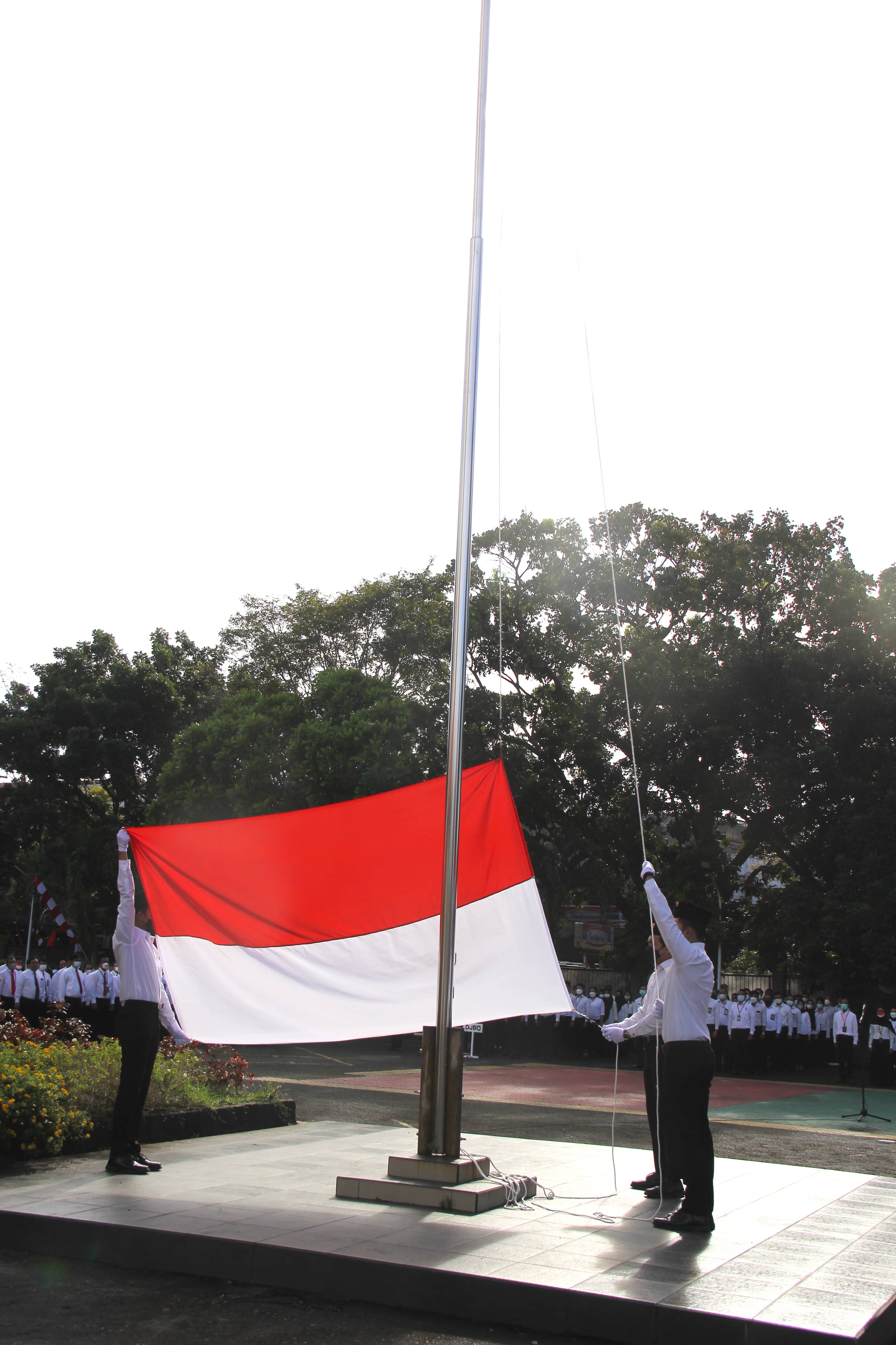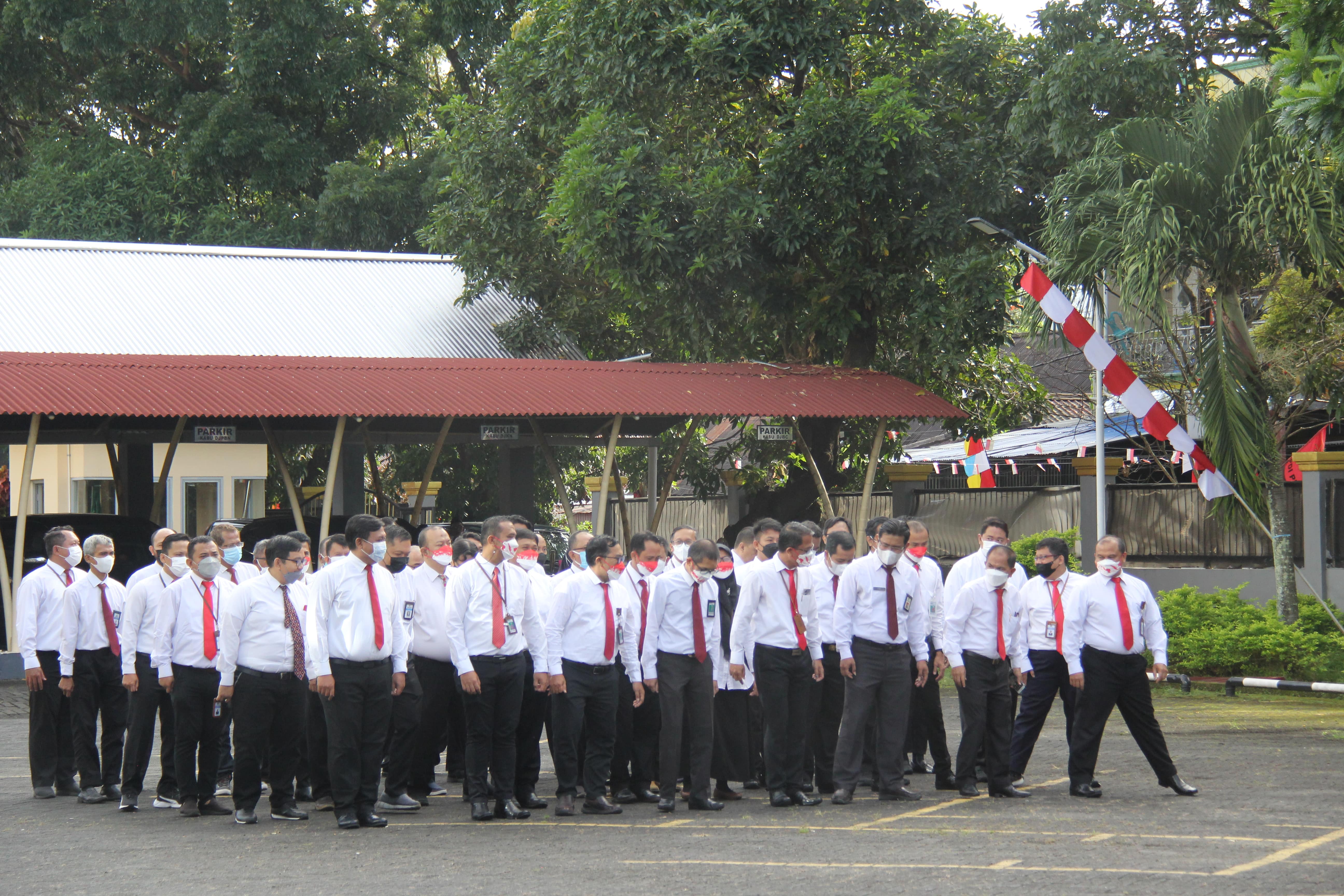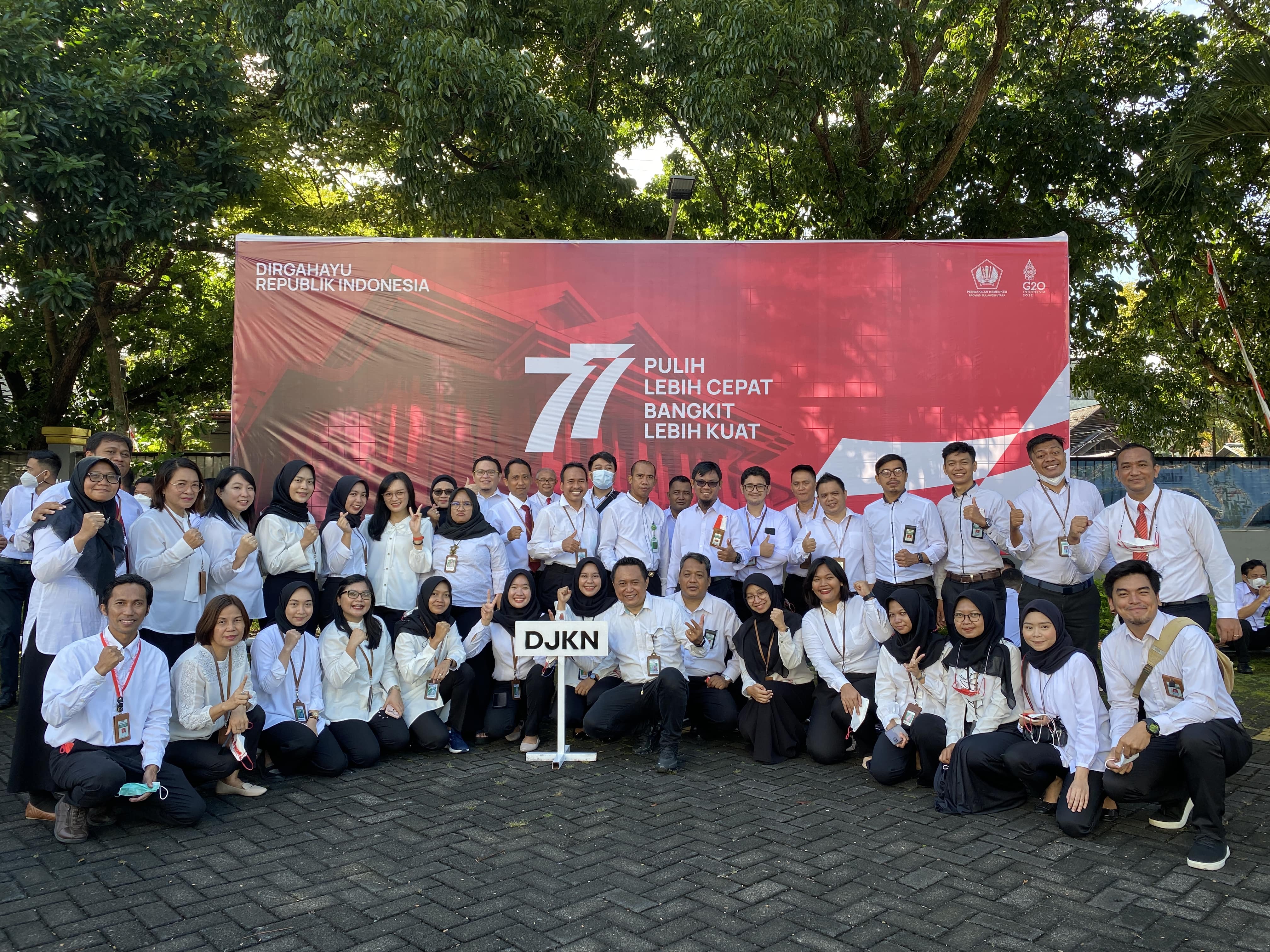 Rabu (17/08/2022), para pejabat dan pegawai Kanwil DJKN Sulawesi Utara, Tengah, Gorontalo, dan Maluku Utara (Suluttenggomalut), KPKNL Manado, bersama unit vertikal di lingkungan Direktorat Jenderal Pajak (DJP), Direktorat Jenderal Perbendaharaan (DJPb), Direktorat Jenderal Bea dan Cukai (DJBC), Badan Pendidikan dan Pelatihan Keuangan (BPPK), serta Sekretariat Jenderal Kementerian Keuangan di wilayah Sulawesi Utara berkumpul untuk menghadiri upacara di Lapangan Parkir Gedung Keuangan Negara Manado. Diketahui sebanyak 12 petugas upacara dan lebih dari 150 peserta upacara turut terlibat.