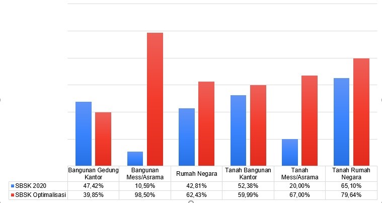 Dari data di atas dapat dilihat bahwa setelah dilakukan optimaliasi, terjadi peningkatan besaran persentase kesesuaian SBSK pada seluruh jenis BMN kecuali Bangunan Gedung Kantor yang mengalami penurunan sebesar 7,57%. Kenaikan persentase merupakan hasil optimalisasi yang dilakukan dengan mekanisme penggunaan, pemanfaatan, atau penghapusan. Persentase yang belum mencapai 100% memiliki arti bahwa masih terdapat ruang untuk melakukan optimalisasi BMN.