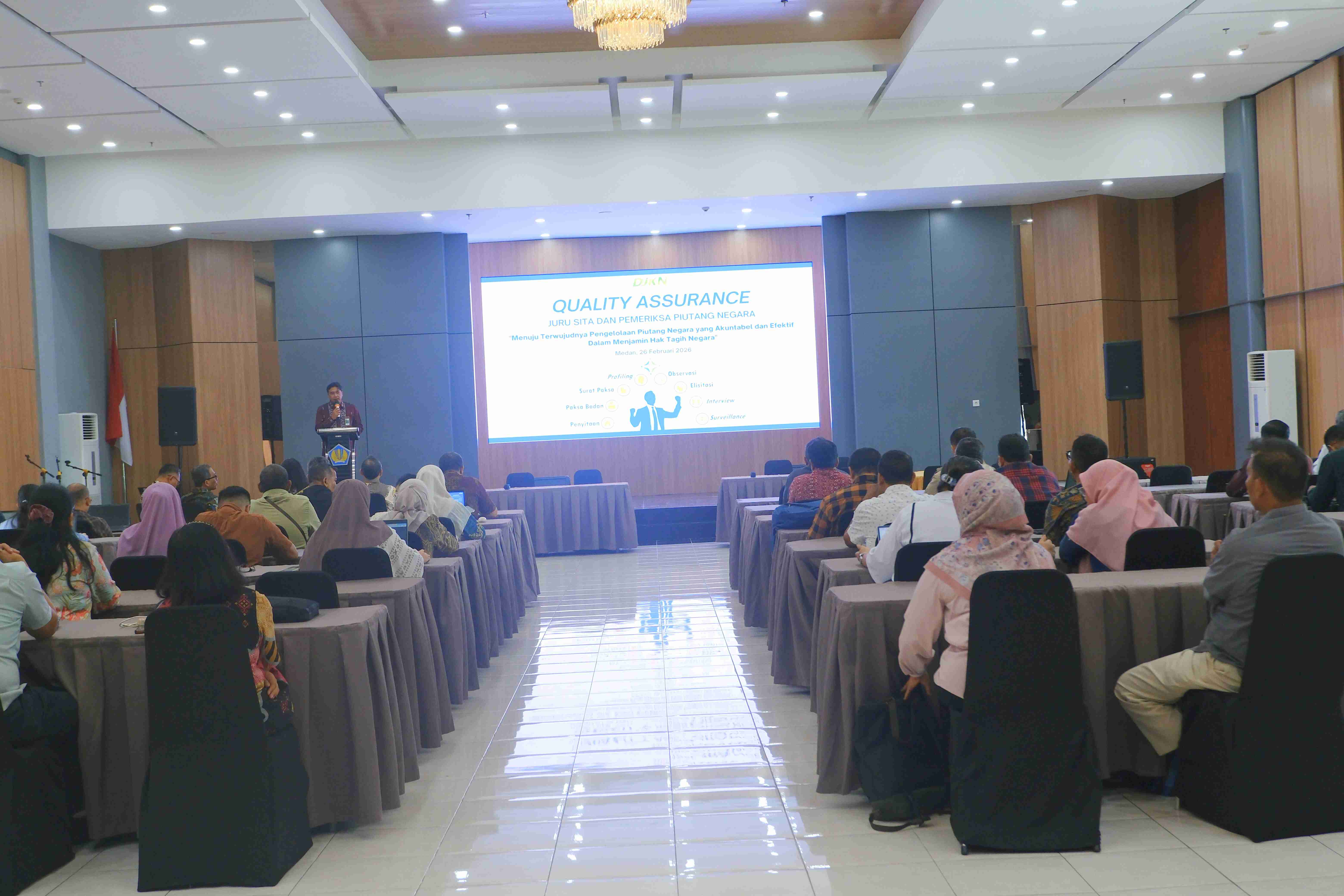 Medan (26/2) – Dalam rangka meningkatkan kualitas pengurusan piutang negara, kompetensi, serta memperkuat akuntabilitas pelaksanaan tugas, telah dilaksanakan kegiatan Quality Assurance (QA) Juru Sita dan Pemeriksa Piutang Negara Tahun 2026 pada 26 Februari 2026. Kegiatan ini bertempat di Aula Putri Hijau Lantai 6 Gedung Keuangan Negara Medan Unit II, Kota Medan, dengan mengusung tema “Menuju Terwujudnya Pengelolaan Piutang Negara yang Akuntabel dan Efektif Dalam Menjamin Hak Tagih Negara.”