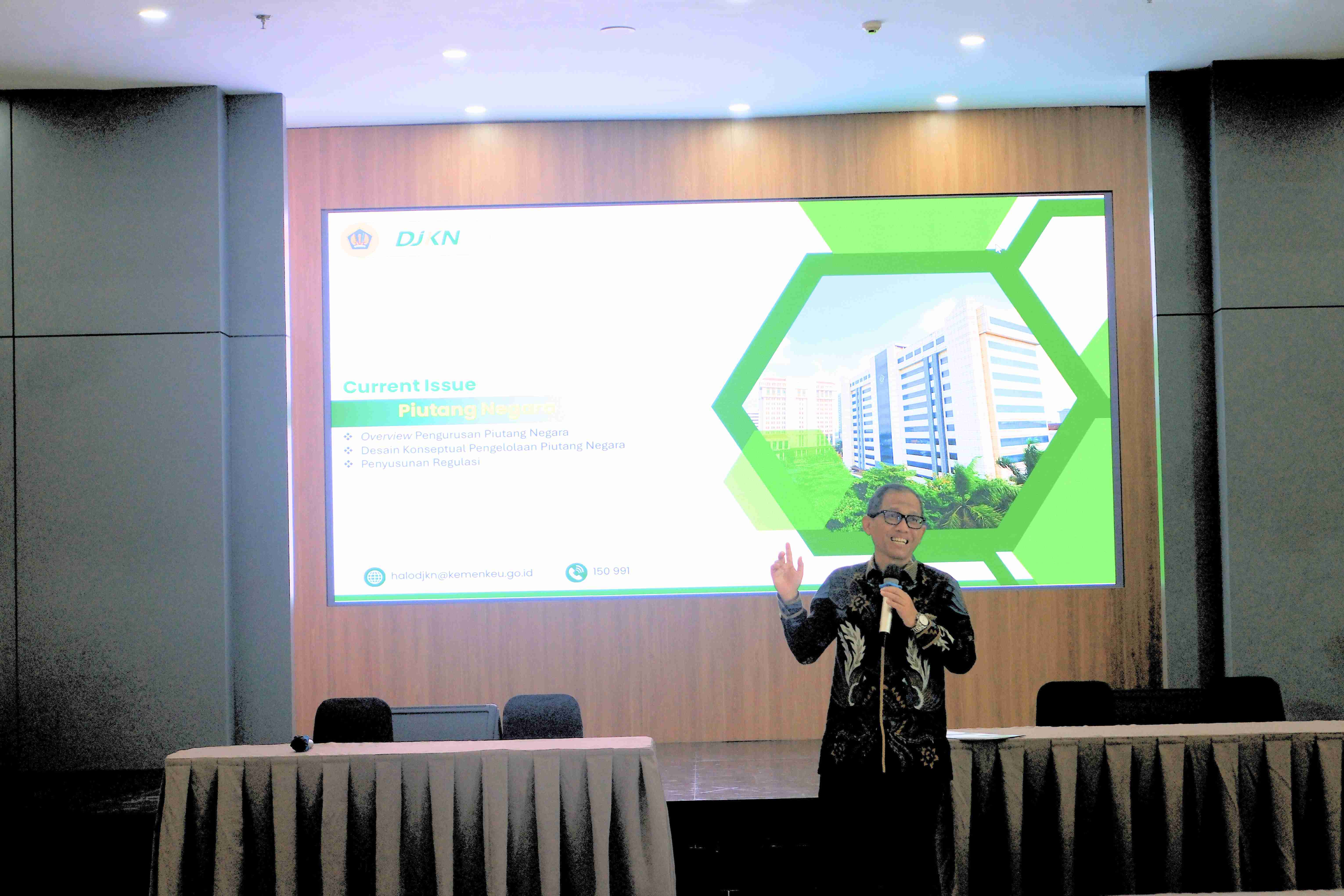 Kegiatan dilanjutkan dengan pemaparan materi oleh Kepala Subdirektorat Perumusan Kebijakan Piutang Negara pada Direktorat Piutang Negara dan Kekayaan Negara Lainnya. Materi yang disampaikan meliputi Overview Pengurusan Piutang Negara, Desain Konseptual Pengelolaan Piutang Negara, serta Penyusunan Regulasi.