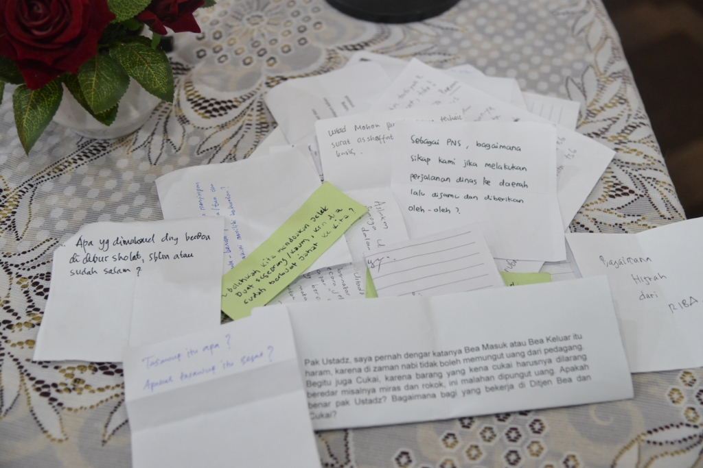 Pertanyaan-pertanyaan yang muncul berkaitan dengan fiqih, aqidah, muamalah, sejarah islam, bahkan ada yang terkait dengan tugas sebagai seorang PNS atau sebagai pegawai DJKN. Pertanyaan yang muncul berkaitan dengan tugas seorang PNS atau Pegawai DJKN diantaranya “Bagaimana sikap kami jika melakukan perjalanan dinas ke daerah lalu dijamu dan diberikan oleh-oleh?”, “Bagaimana pandangan Islam terkait gratifikasi?”, “Apakah PNS tidak diperkenankan menggunakan fasilitas kantor untuk keperluan pribadi?”, dan “Di kantor kami terdapat unit yang mengurusi dan membuat regulasi penagihan piutang negara (termasuk di dalamnya bunga dan denda), apakah hal tersebut termasuk riba? Apakah yang bekerja di bagian tersebut termasuk pencatat riba?”.