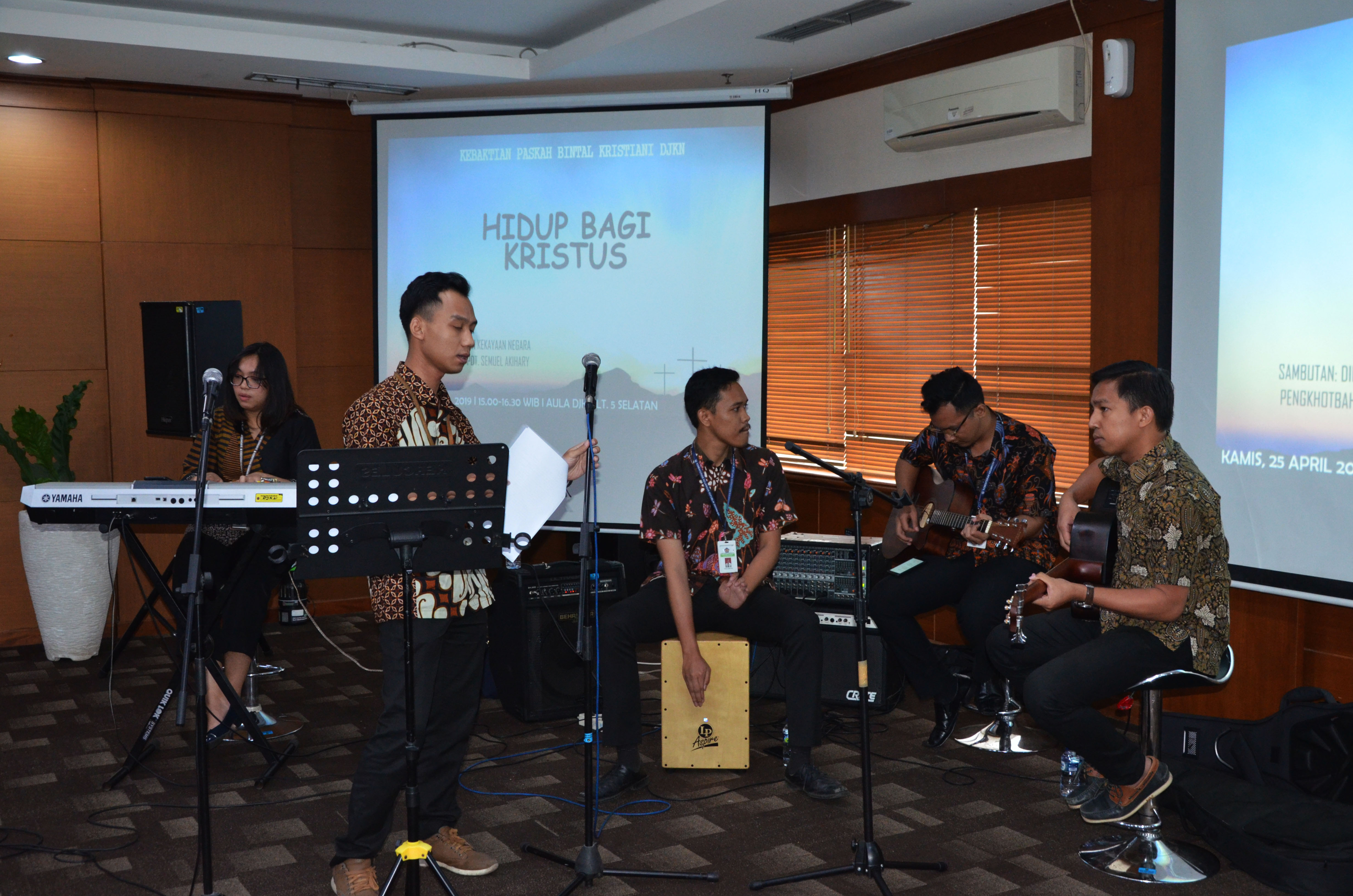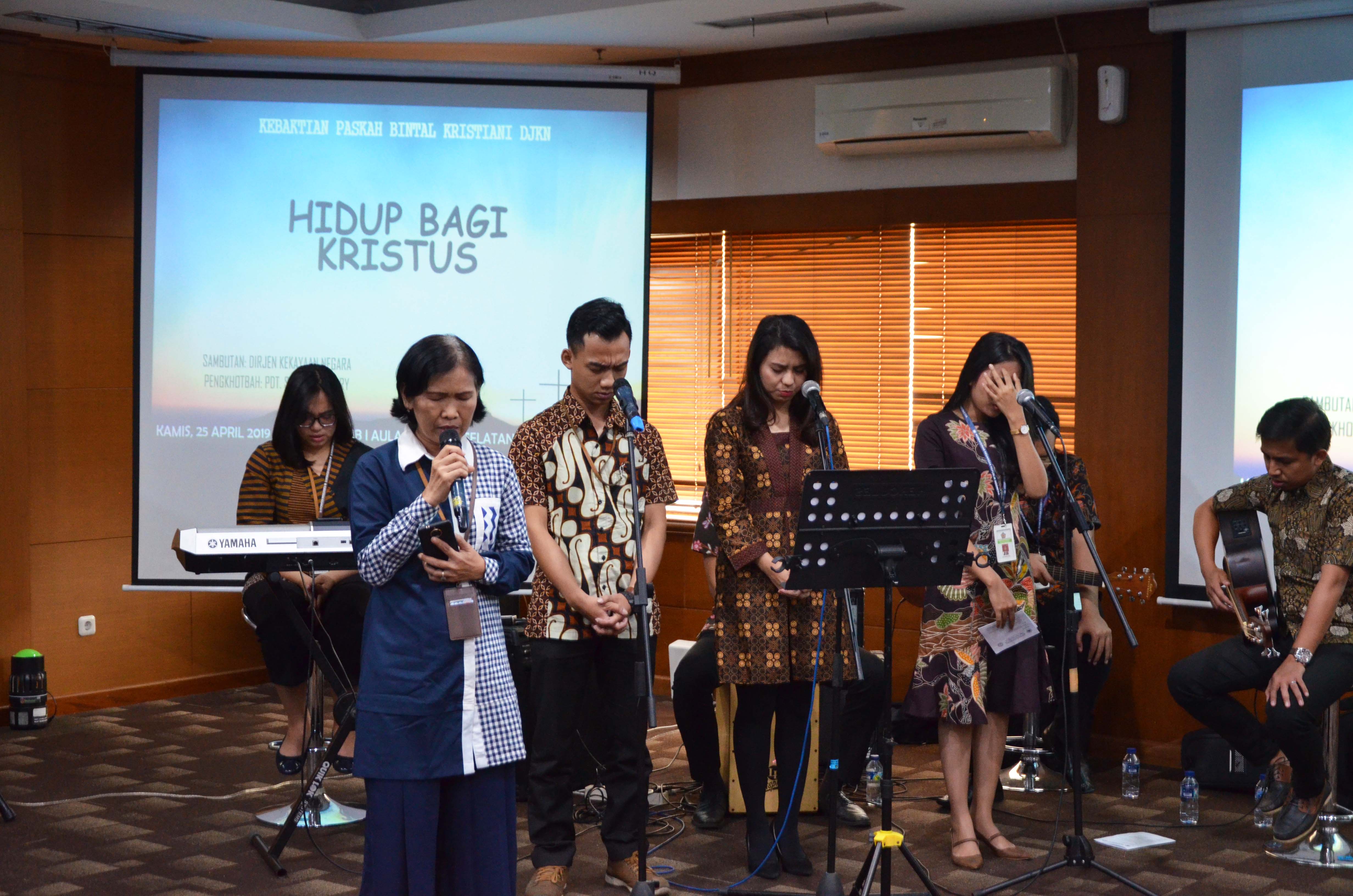 Ibadah Paskah DJKN Tahun 2019 yang bertemakan “Kebangkitan Kristus membangkitkan semangat kita untuk memberikan diri bagi-Nya melalui hidup dan pelayanan kita sebagai PNS Kementerian Keuangan yang mencerminkan nilai-nilai Kementerian Keuangan” ini dipimpin oleh Pdt. Samuel Akihary, dengan dihadiri oleh para pejabat dan pegawai Katolik dan Kristen di lingkungan Kantor Pusat DJKN dan Kanwil DJKN DKI Jakarta. (Nez/Britka/Humas)