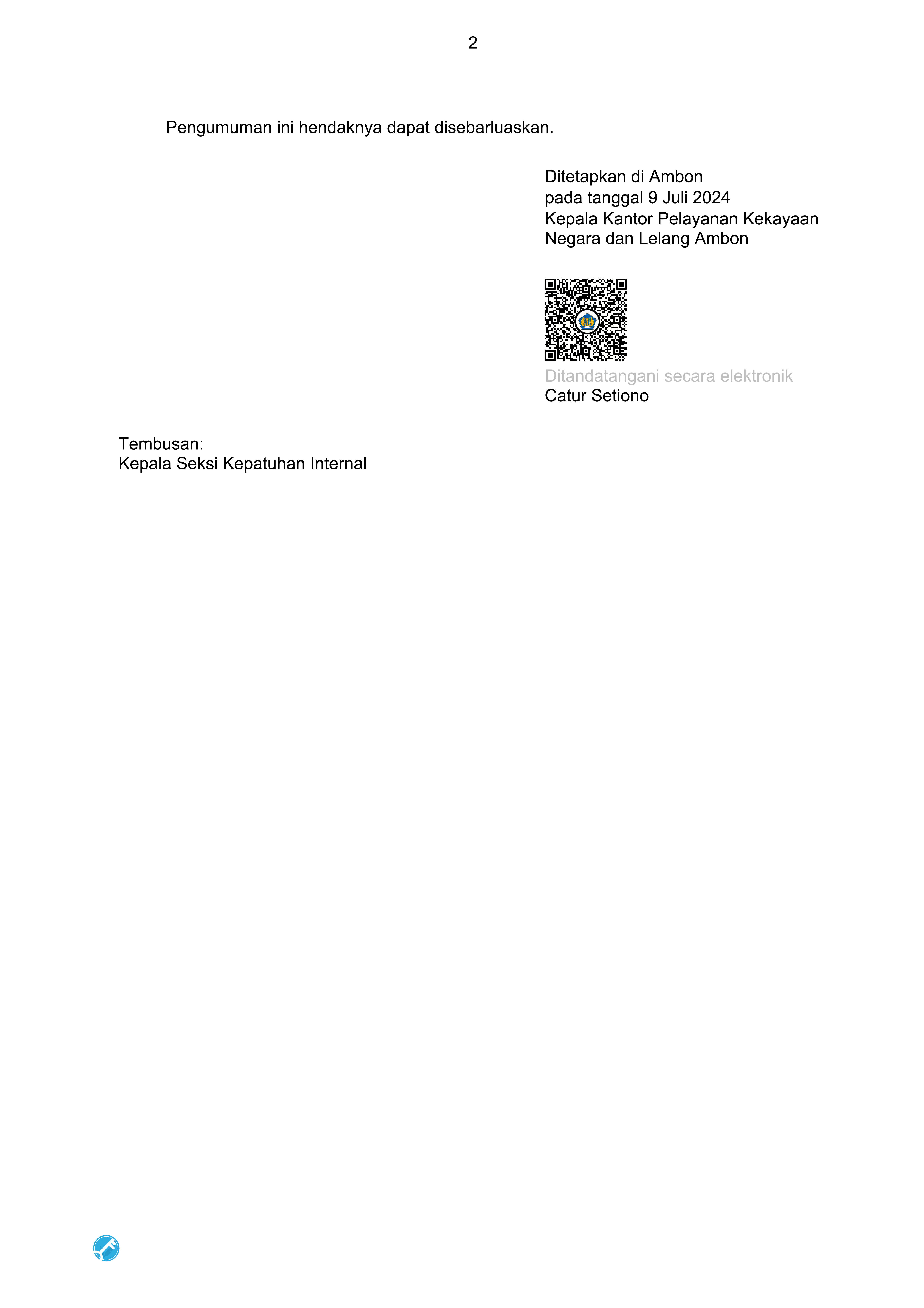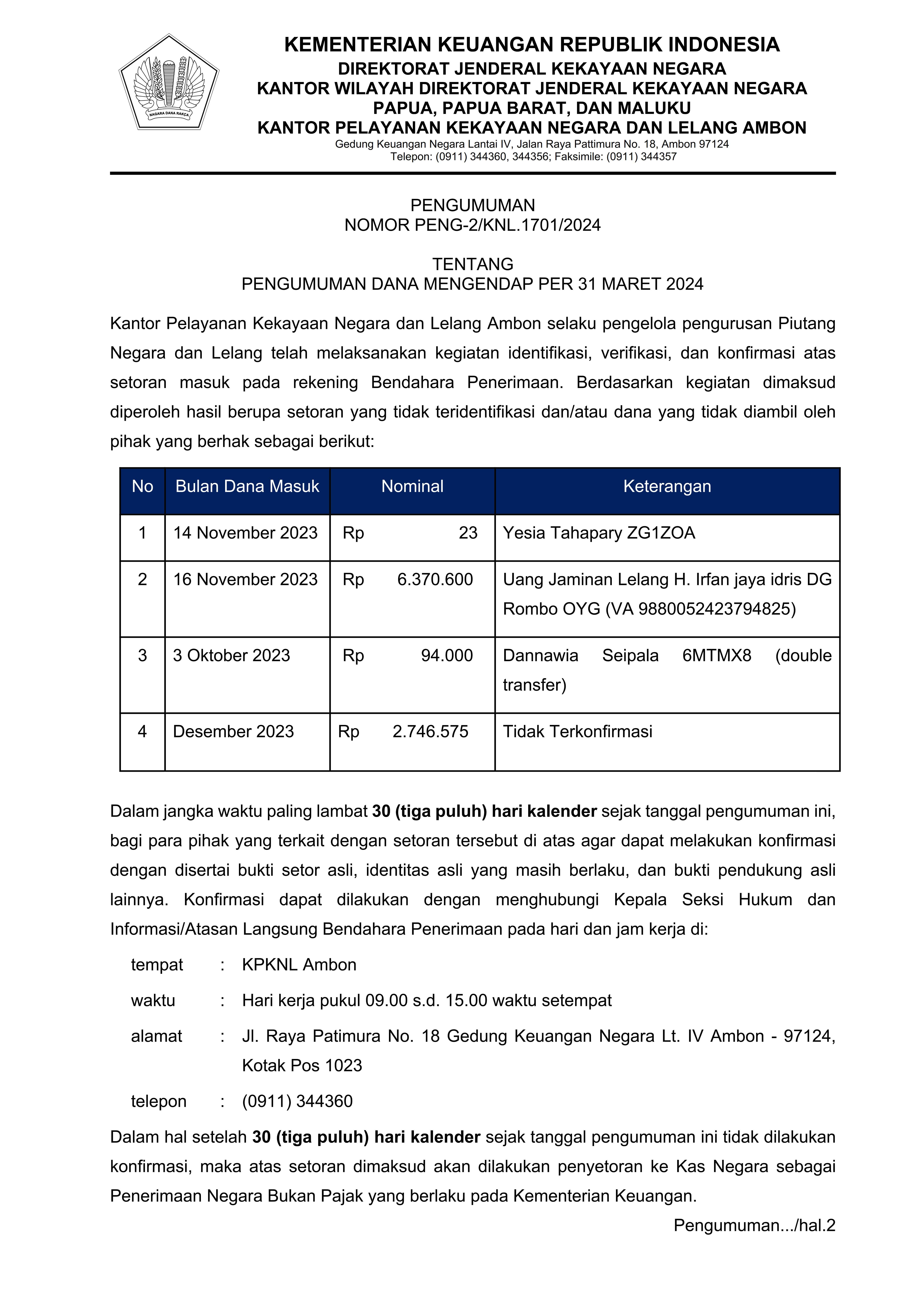 Pengumuman Daftar Setoran Masuk yang Tidak Teridentifikasi dan Dana yang Tidak Diambil oleh Pihak yang Berhak di Rekening KPKNL Ambon