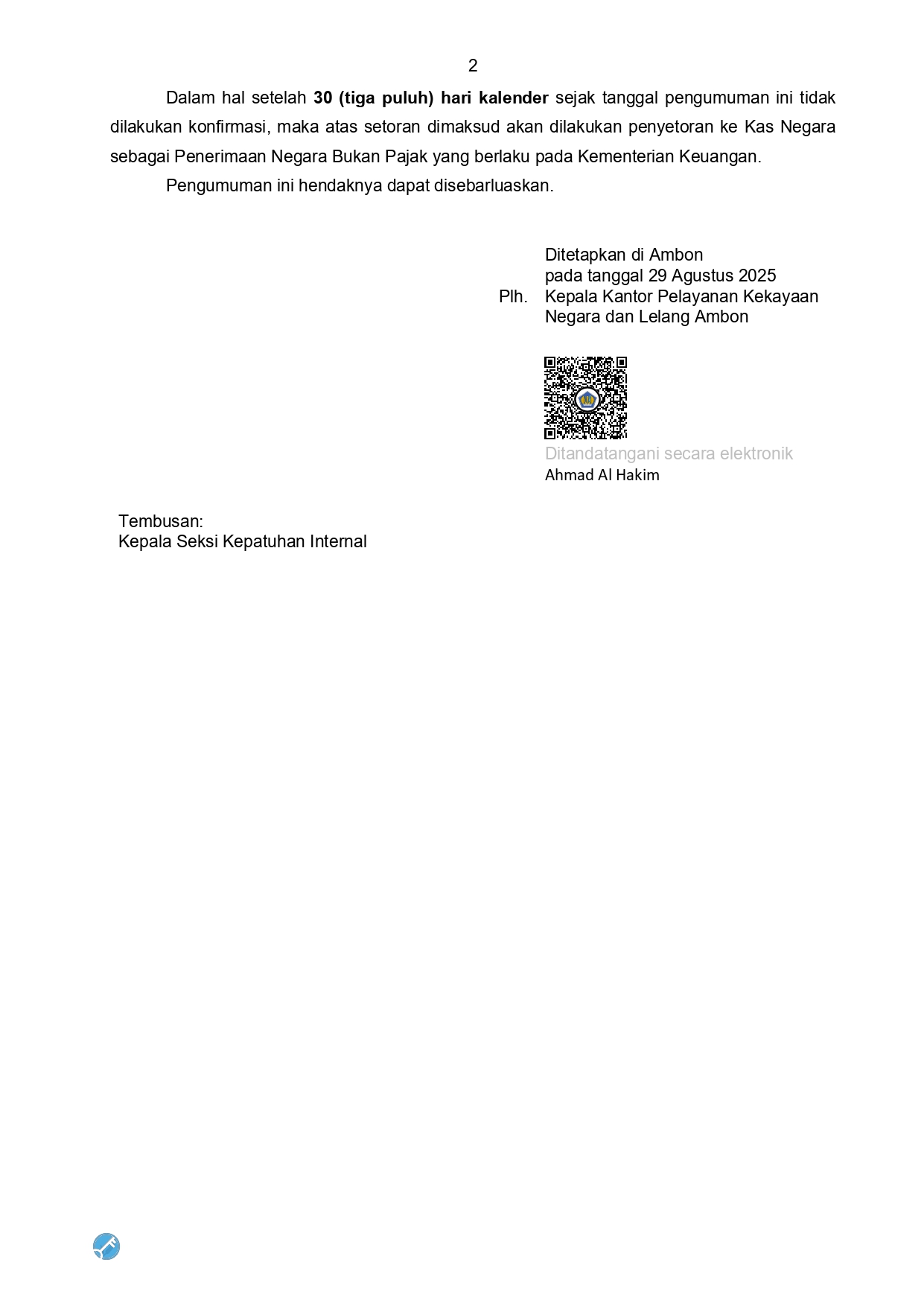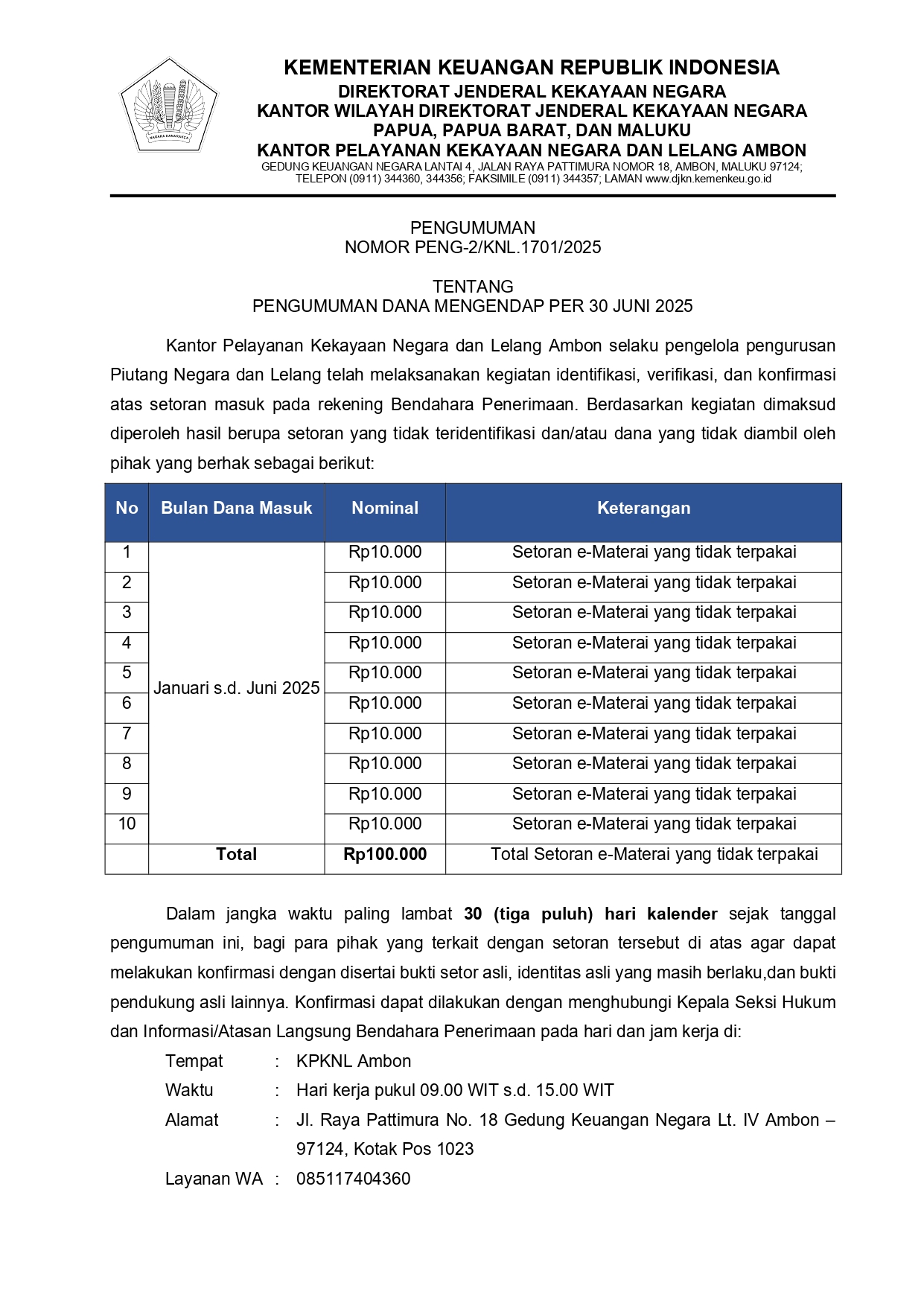 Pengumuman Daftar Setoran Masuk yang Tidak Teridentifikasi dan Dana yang Tidak Diambil oleh Pihak yang Berhak di Rekening KPKNL Ambon