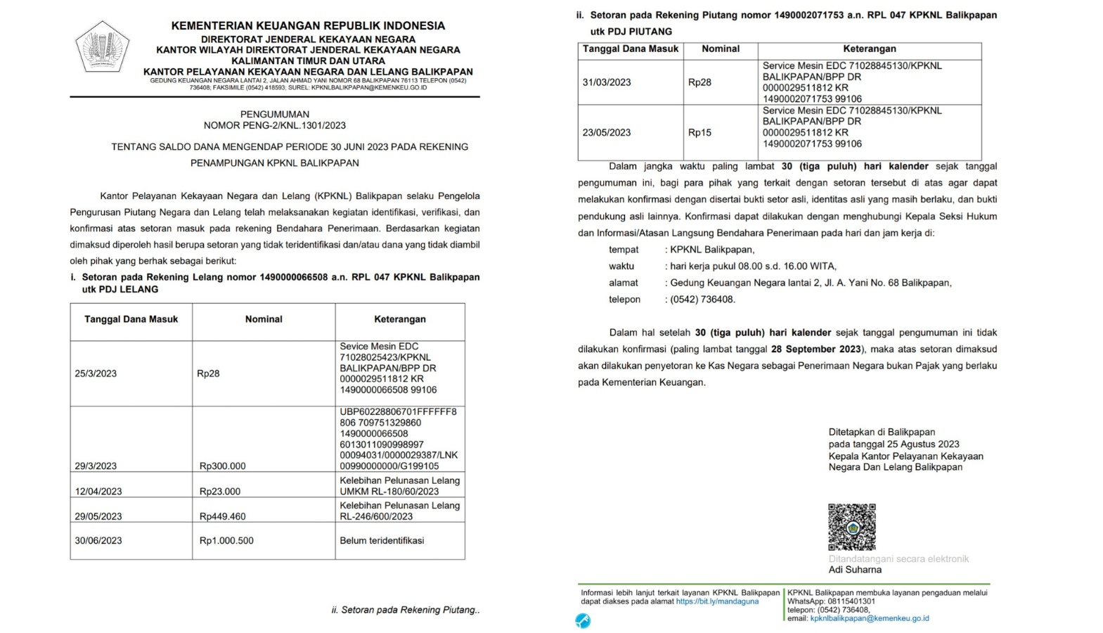 Pengumuman atas Saldo Mengendap lebih dari 6 Bulan pada Rekening Penampungan KPKNL Balikpapan