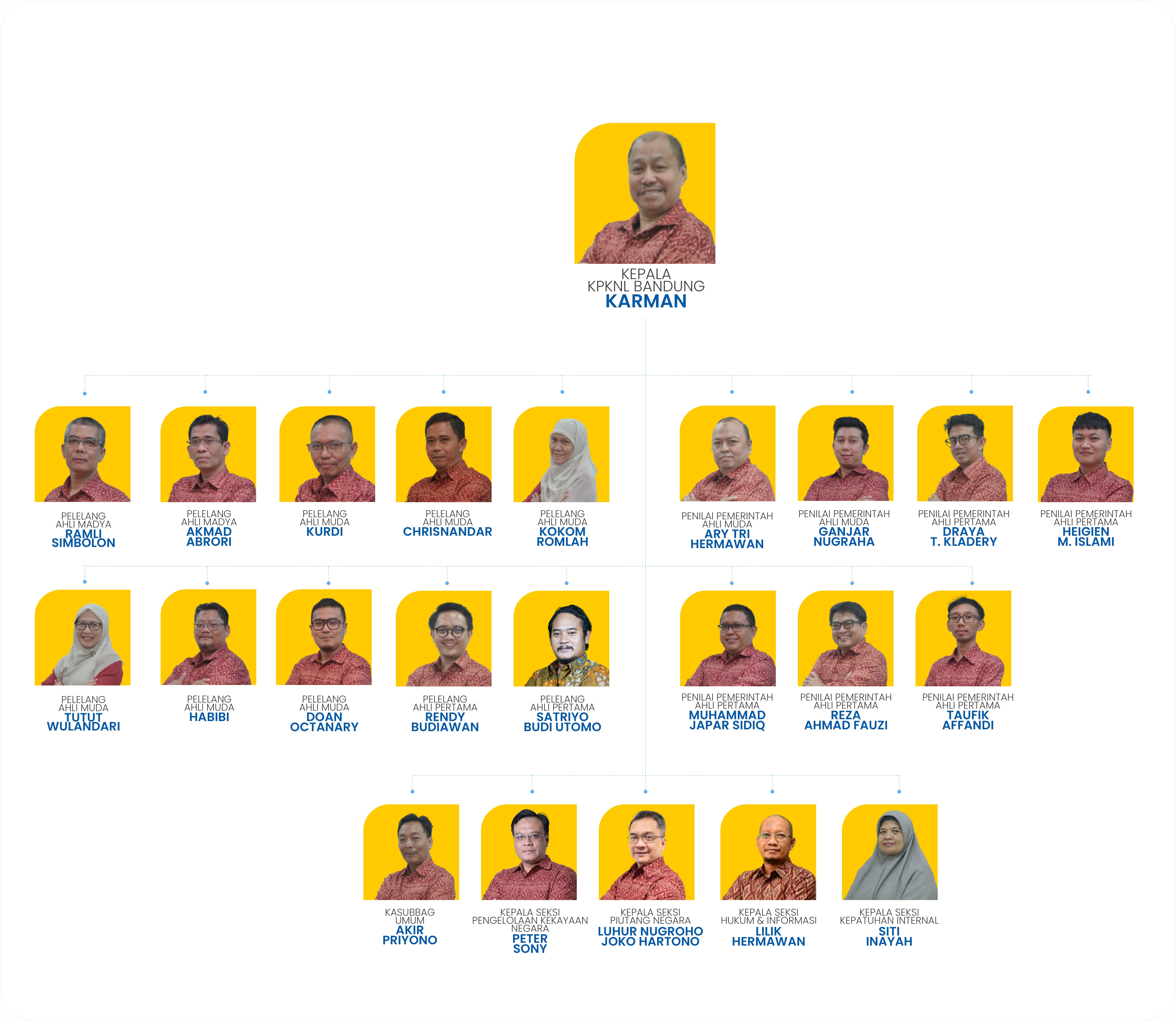 KPKNL saat ini dipimpin oleh Karman, seorang pemimpinyang humoris dan dekat dengan pegawai dibawahnya, juga seorang pekerja keras.Sehingga mampu memimpin KPKNL Bandung dengan kondisi kerja yang serius tapisantai. Karman dalam menahkodai KPKNL Bandung dibantu oleh 5 (lima)orang Kepala Seksi (Eselon IV), yaitu Akir Priyono (Kasubbag Umum), Hakim S.B Mulyono (Kepala Seksi Pengelolaan Kekayaan Negara), Elsa Marta Oktavia (Kepala Seksi Piutang Negara), Wiwin Rianto (Kepala Seksi Hukum dan Informasi), dan Harry Prasetya (Kepala Seksi Kepatuhan Internal). KPKNL Bandung juga didukung para Pejabat Fungsional yaitu 2 (dua) orang Pelelang Ahli Madya, 6 (enam) orang Pelelang Ahli Muda, 2 (dua) orang Pelelang Ahli Pertama, 2 (dua) orang Penilai Pemerintah Ahli Pertama, 2 (dua) orang Penilai Pemerintah Ahli Muda, dan 4 (empat) orang Penilai Pemerintah Ahli Pertama.