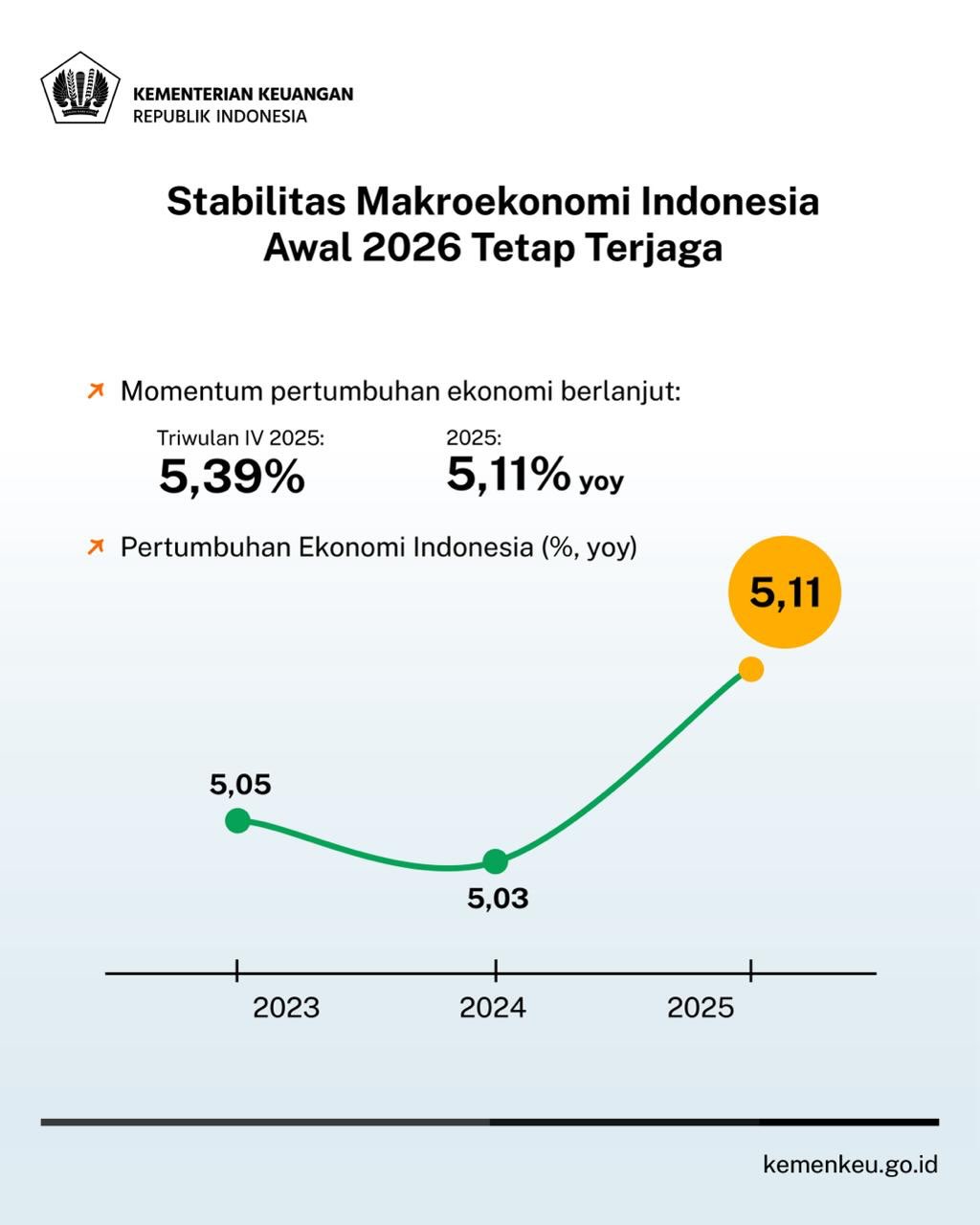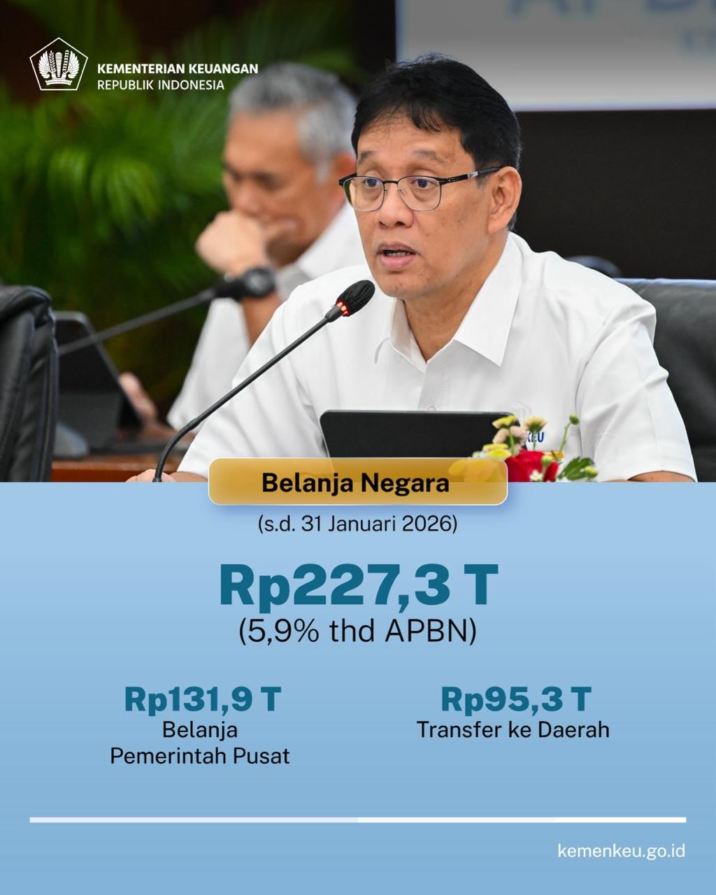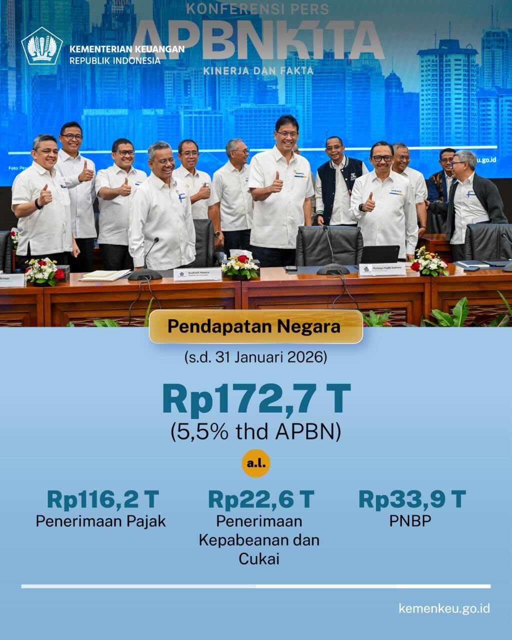 Perekonomian Indonesia pada tahun 2025 berhasil tumbuh 5,11% yoy dengan pertumbuhan di kuartal terakhir mencapai 5,39% yoy. Momentum ini terus terjaga hingga di awal tahun 2026. Postur APBN sampai dengan 31 Januari 2026: