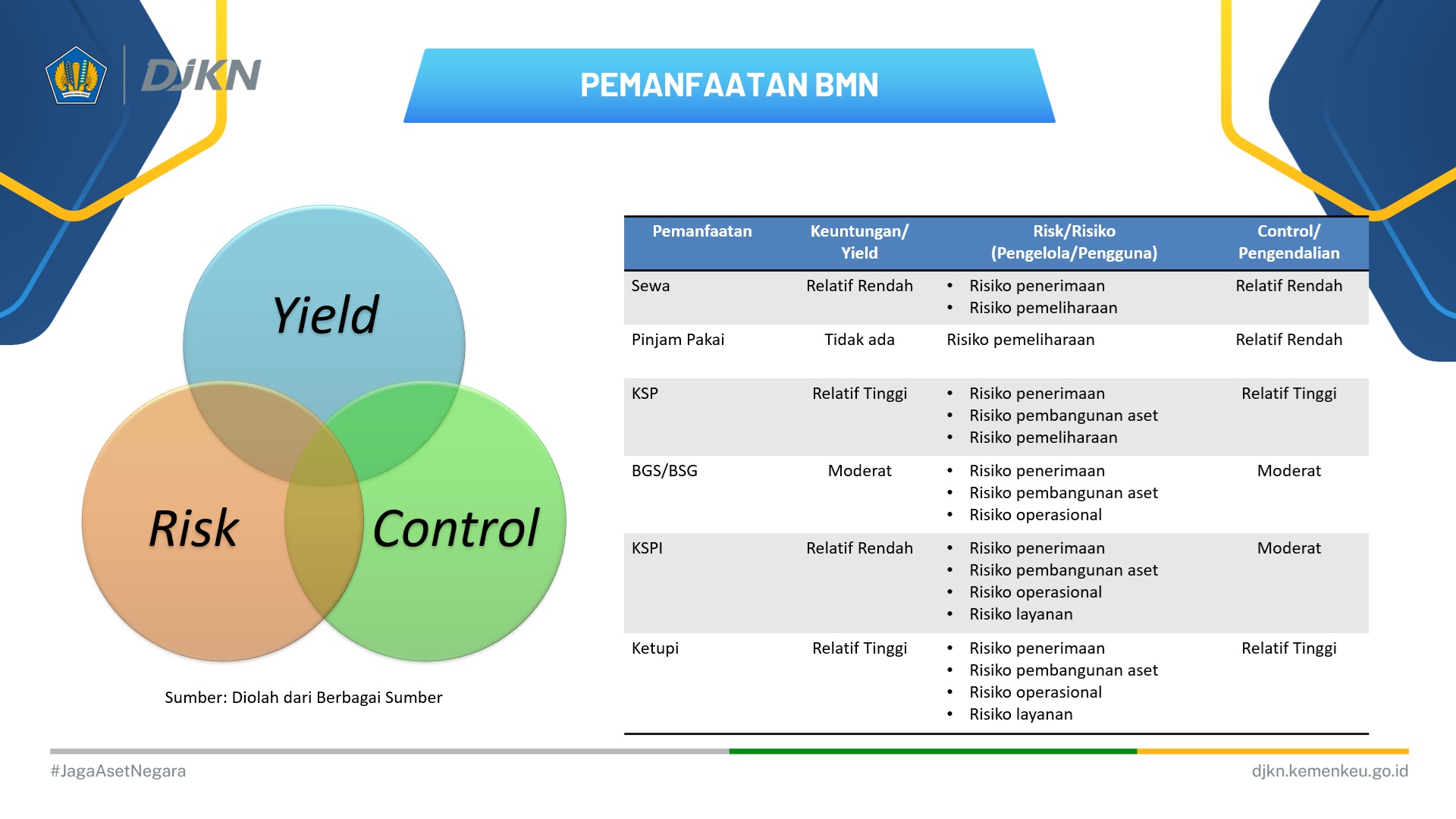 Sesuai dengan definisi dan jenisnya, pemanfaatan BMN merupakan salah satu bentuk kerja sama bisnis/usaha yang dilakukan oleh Pemerintah dan mitra. Tentu saja, dalam pelaksanaan kerjasama bisnis/usaha para pihak akan mempertimbangkan 3 (tiga) dimensi penting, yakni keuntungan, risiko, dan kontrol/pengendalian. Semakin tinggi keuntungan yang diharapkan, maka akan semakin tinggi risiko yang diambil sehingga fungsi kontrol/pengendalian bisnis menjadi semakin tinggi. Tentu saja kadar penilaian ketiga faktor tersebut berbeda-beda untuk setiap jenis usaha yang bergantung pada kompleksitasnya. Sebagai contoh, Pengguna Barang atau Pengelola Barang tidak berkepentingan dengan risiko usaha mitra dalam pelaksanaan sewa, sehingga risiko terbesar dalam pelaksanaan sewa BMN bagi pemilik barang adalah penerimaan PNBP dan pemeliharaan BMN agar tetap dapat digunakan. Hal tersebut jauh berbeda dengan pelaksanaan KSPI dimana Pengguna Barang dan Pengelola Barang berkepentingan untuk memastikan bahwa infrastruktur dapat dibangun oleh mitra sesuai dengan spesifikasinya dan memastikan bahwa fungsi layanan infrastruktur tersebut tersampaikan (delivery) kepada pengguna layanan/masyarakat.