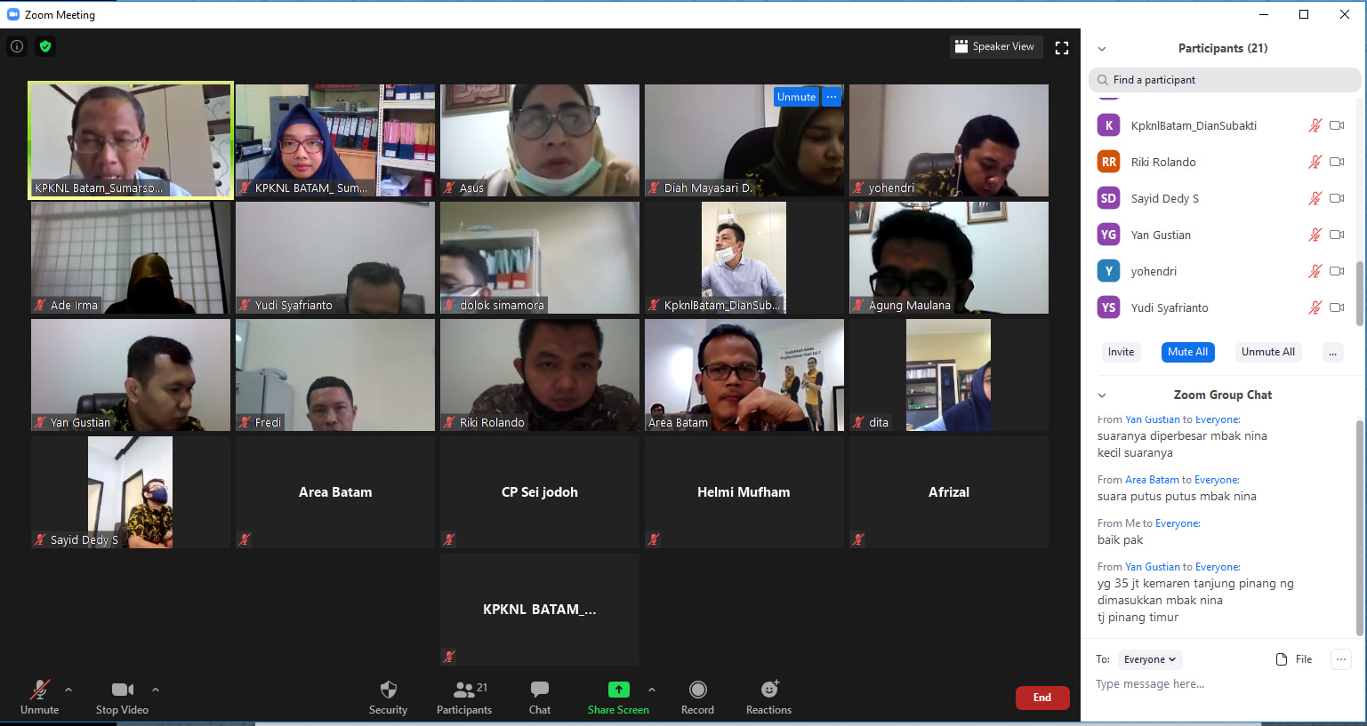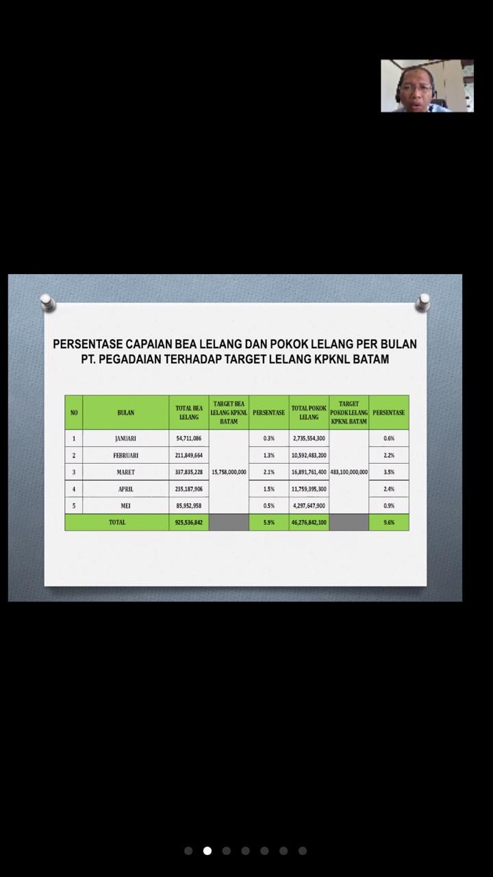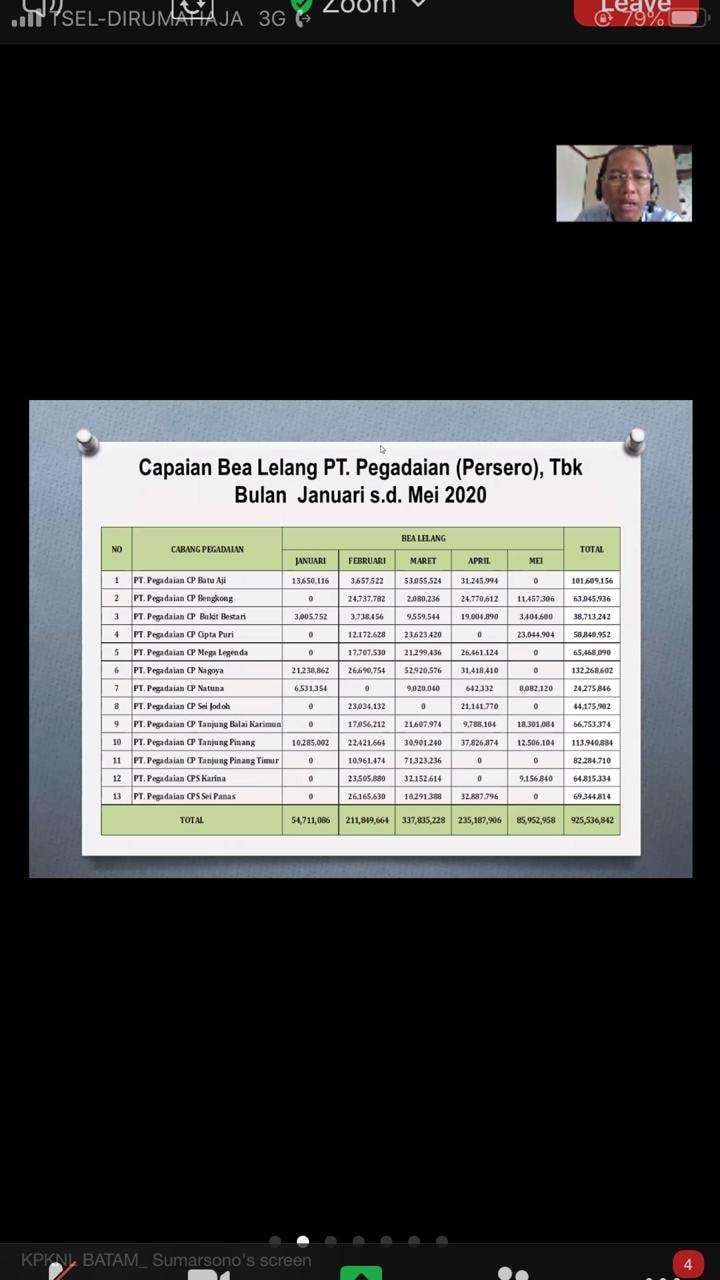 Rabu, 10 Juni 2020. KPKNL Batam mengadakan rapat bersama seluruh kepala kantor cabang Pegadaian sewilayah Kepri melalui aplikasi Zoom Meeting. Rapat ini bertujuan untuk memonitor prognosa target lelang Pegadaian.
