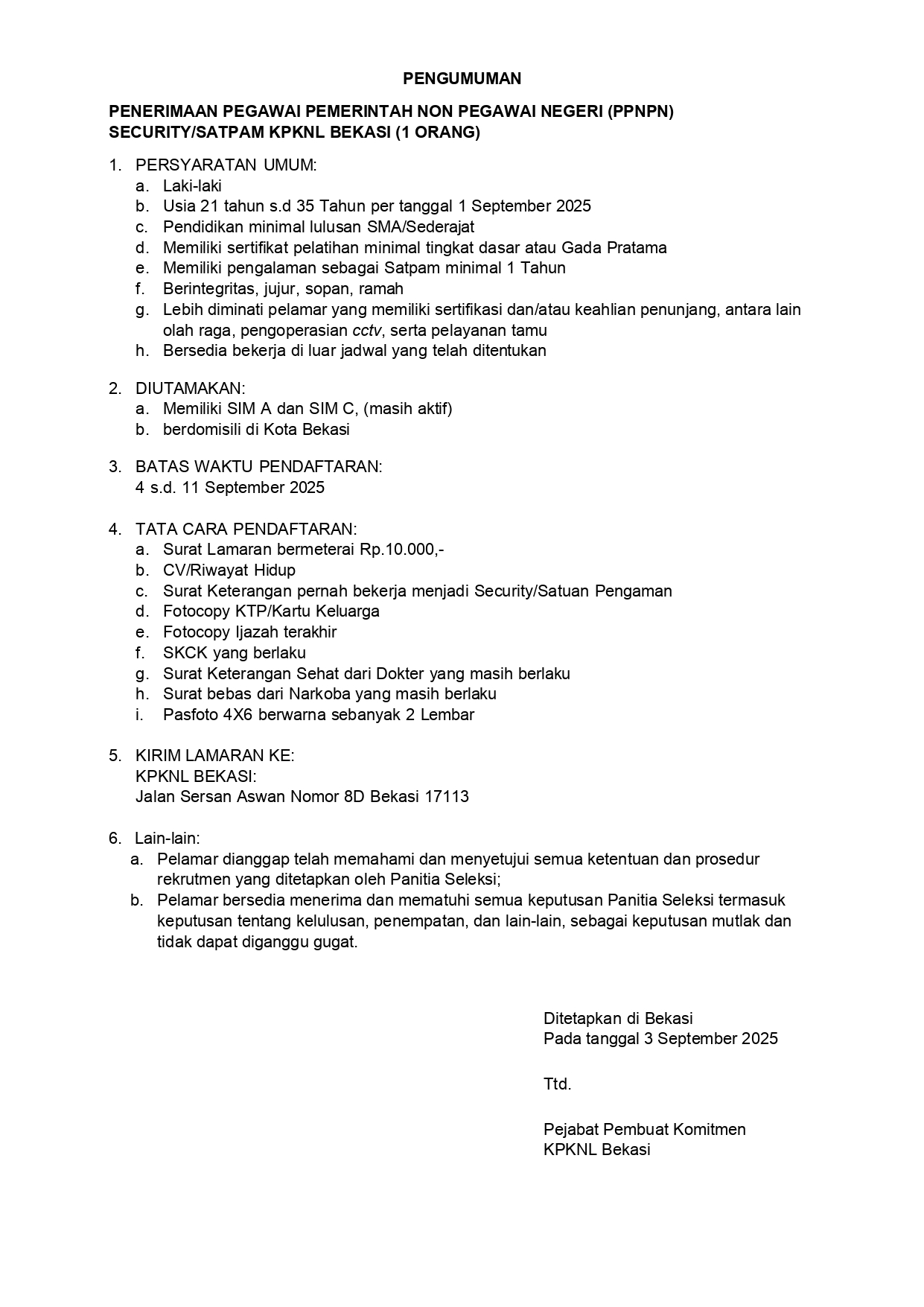 Penerimaan Pegawai Pemerintah Non Pegawai Negeri (PPNPN) Satpam KPKNL Bekasi