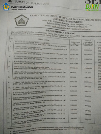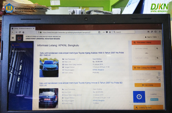 Bengkulu – Kantor Pelayanan Kekayaan Negara dan Lelang (KPKNL) Bengkulu kembali melaksanakan lelang non eksekusi wajib Barang Milik Negara (BMN) yang dapat diikuti siapa aja dan dimana aja melalui smartphone (ponsel pintar). Terdapat enam mobil dinas (mobdin) Universitas Negeri Bengkulu (UNIB) yang akan dilelang secara online (e-Auction) melalui website resmi Direktorat Jenderal Kekayaan Negara (DJKN) Kementerian Keuangan Republik Indonesia (Kemenkeu RI) www.lelangdjkn.kemenkeu.go.id , pada besok Kamis (01/02/2018).