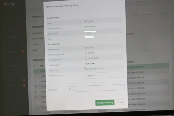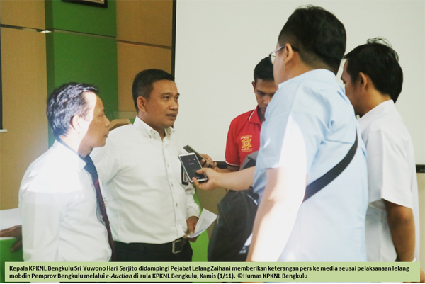 Lelang mobdin Pemprov Bengkulu tersebut dilaksanakan melalui penawaran secara tertutup tanpa kehadiran peserta lelang dan telah diumumkan di salah satu media cetak harian ternama di Bengkulu melalui Pengumuman Lelang Nomor 032/8621/BPKD.6/2018. Selain itu, juga diumumkan pada situs lelang internet DJKN di www.lelangdjkn.kemenkeu.go.id. Dalam pengumuman lelang tersebut telah dicantumkan objek lelang beserta nilai limitnya, deskripsi pelaksanaan lelang, dan persyaratan lelang itu sendiri, sesuai Peraturan Menteri Keuangan (PMK) Nomor 27 Tahun 2016 tentang Petunjuk Pelaksanaan Lelang. “PMK tersebut guna mewujudkan lelang yang lebih transparan, akuntabel, adil, dan menjamin kepastian hukum”, ujar Pejabat Lelang KPKNL Bengkulu Zaihani.