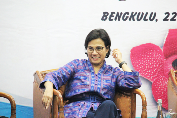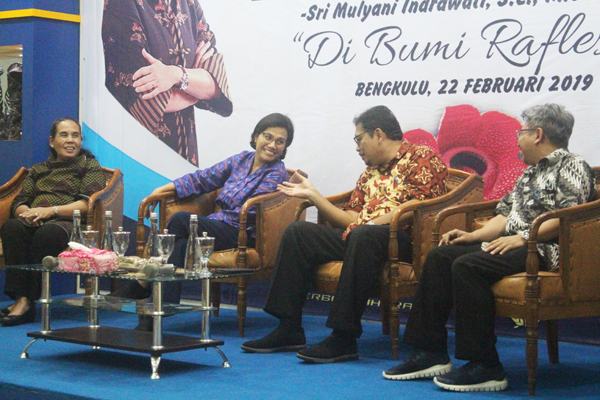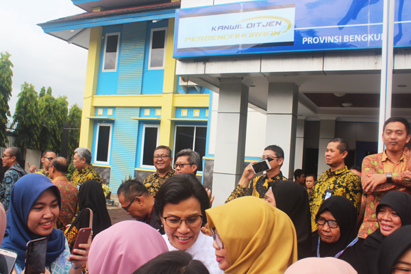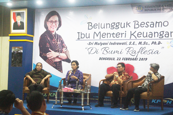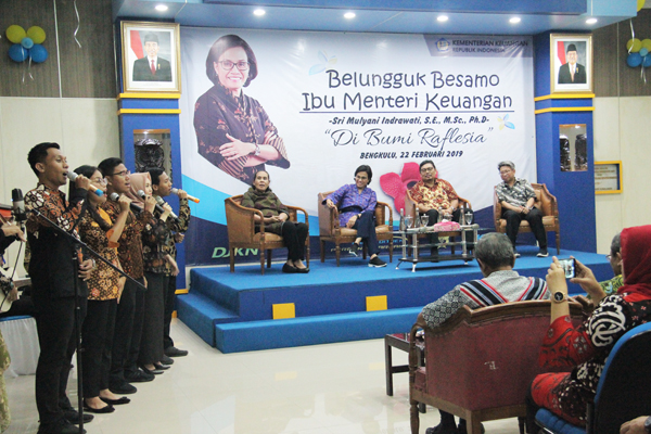 Bengkulu – Menteri Keuangan (Menkeu) Sri Mulyani Indrawati menggelar acara bincang santai bersama jajaran pegawai Kementerian Keuangan (Kemenkeu) yang bertugas di Provinsi Bengkulu, aula Kantor Wilayah Direktorat Jenderal Perbendaharaan (Kanwil DJPB) Provinsi Bengkulu, Jumat (22/2).
