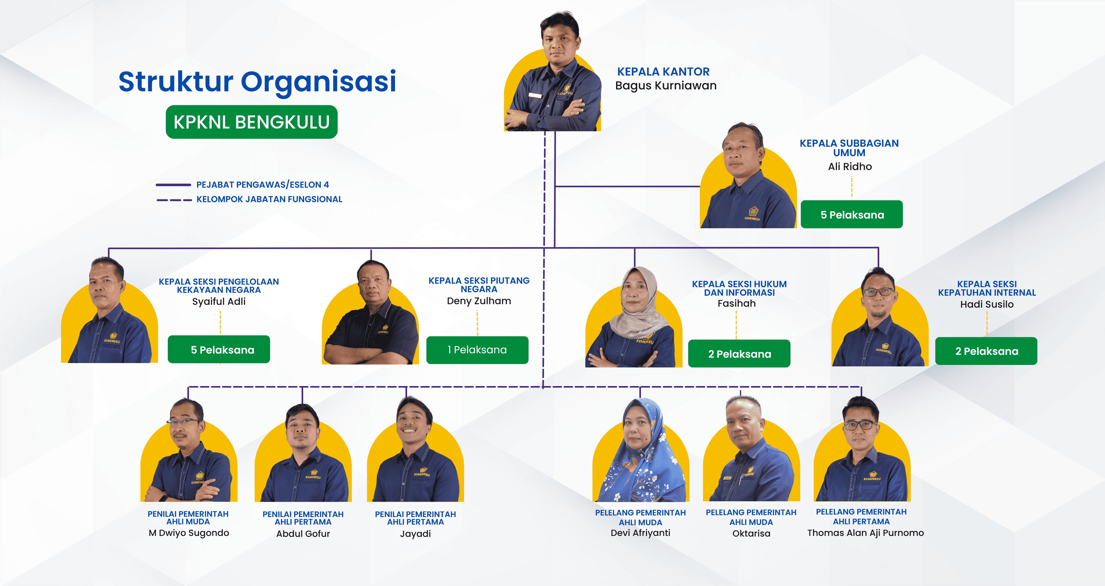 Dalam menjalankan tugas dan fungsinya, KPKNL Bengkulu didukung oleh 27 orang Pegawai ASN dan 12 orang Pegawai Pemerintah Non Pegawai Negeri (PPNPN).