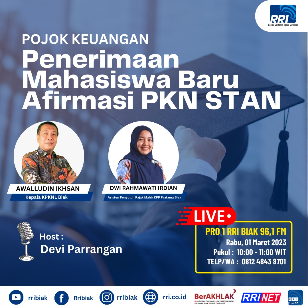 KPKNL Biak bersama dengan KPPN Biak, KPPBC Tipe Madya Pabean C Biak, dan KPP Pratama Biak yang tergabung dalam Kemenkeu Satu Biak melaksanakan sosialisasi Program Afirmasi Politeknik Keuangan Negara-Sekolah Tinggi Akuntansi Negara (PKN-STAN) ke beberapa sekolah menengah atas yang ada Kabupaten Biak Numfor dan Kabupaten Supiori.