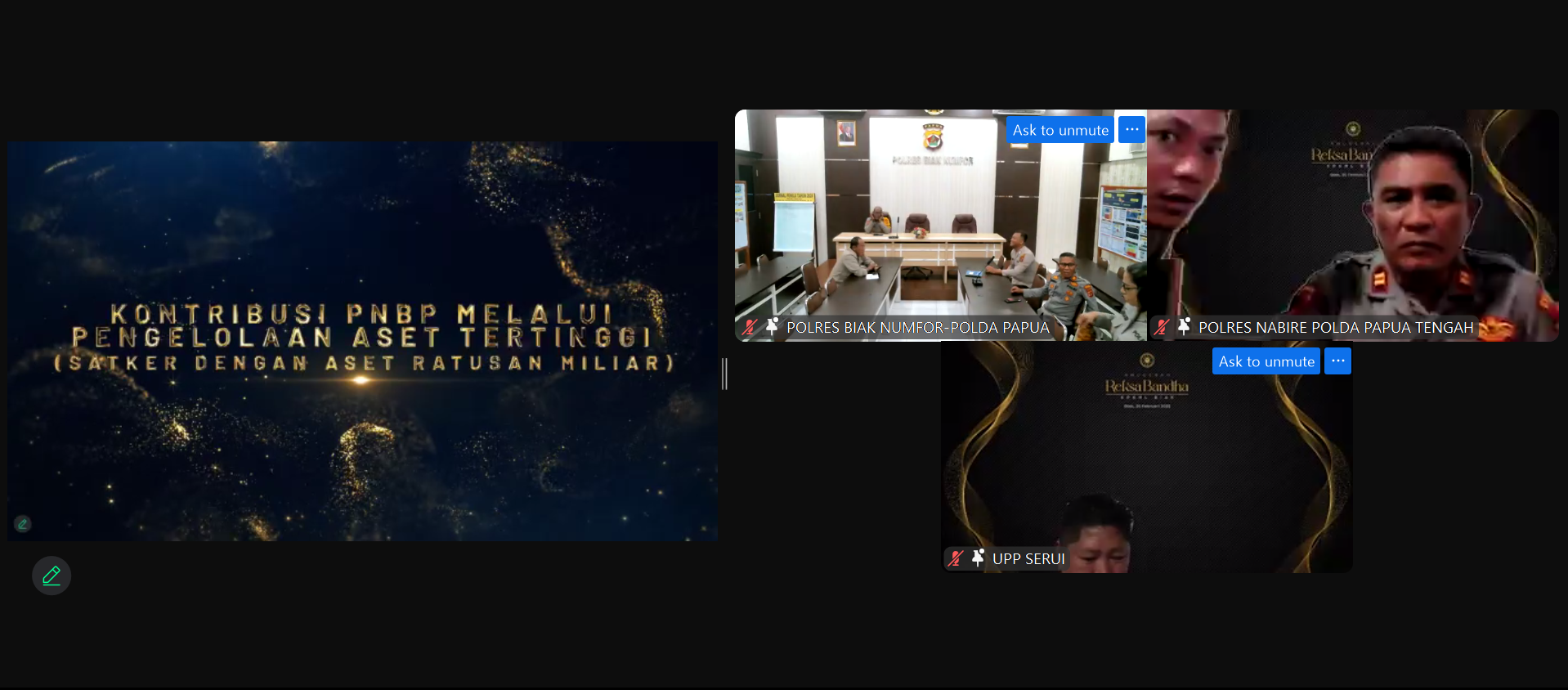 "Perkenankan saya mengucapkan terima kasih serta penghargaan setinggi-tingginya atas kerjasama yang telah terjalin, sinergi, serta kontribusi secara aktif dari bapak/ibu sekalian sehingga kita dapat terus bekerja sama untuk optimalisasi aset negara, pelaksanaan lelang, serta penilaian sehingga dapat mewujudkan untuk pengelolaan aset Barang Milik Negara maupun Daerah lebih optimal lagi," ujar Kepala Kanwil DJKN Papua, Papua Barat, dan Maluku Kritijanindyati Puspitasari dalam sambutannya.