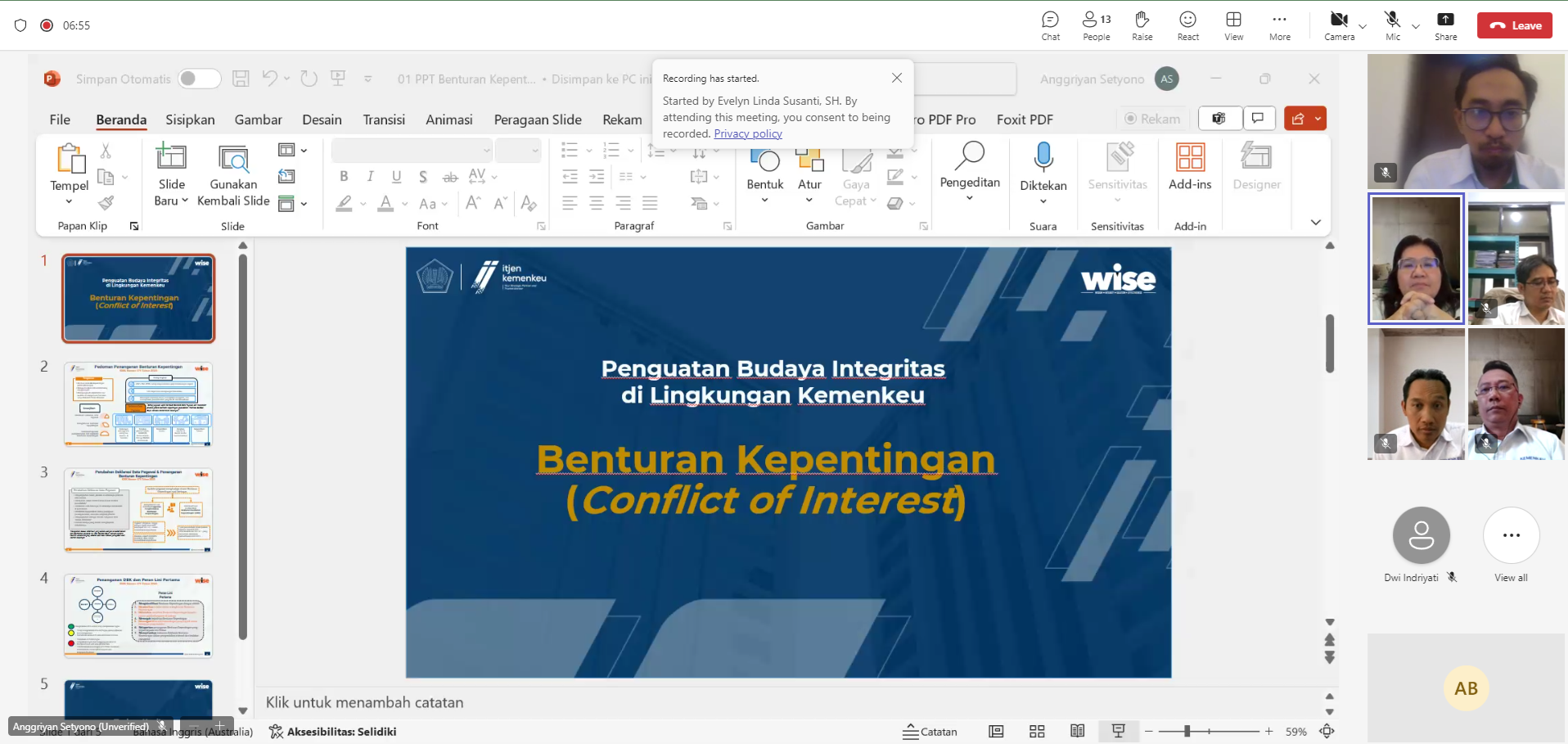 Untuk meningkatkan pemahaman pegawai dan PPNPN KPKNL Bogor, Rabu 6 Mei 2024, melalui media daring telah diadakan internalisasi mengenai Penanganan Benturan Kepentingan (Conflict of Interest) dengan narasumber Bimo Aryo, Kepala KPKNL Bogor.