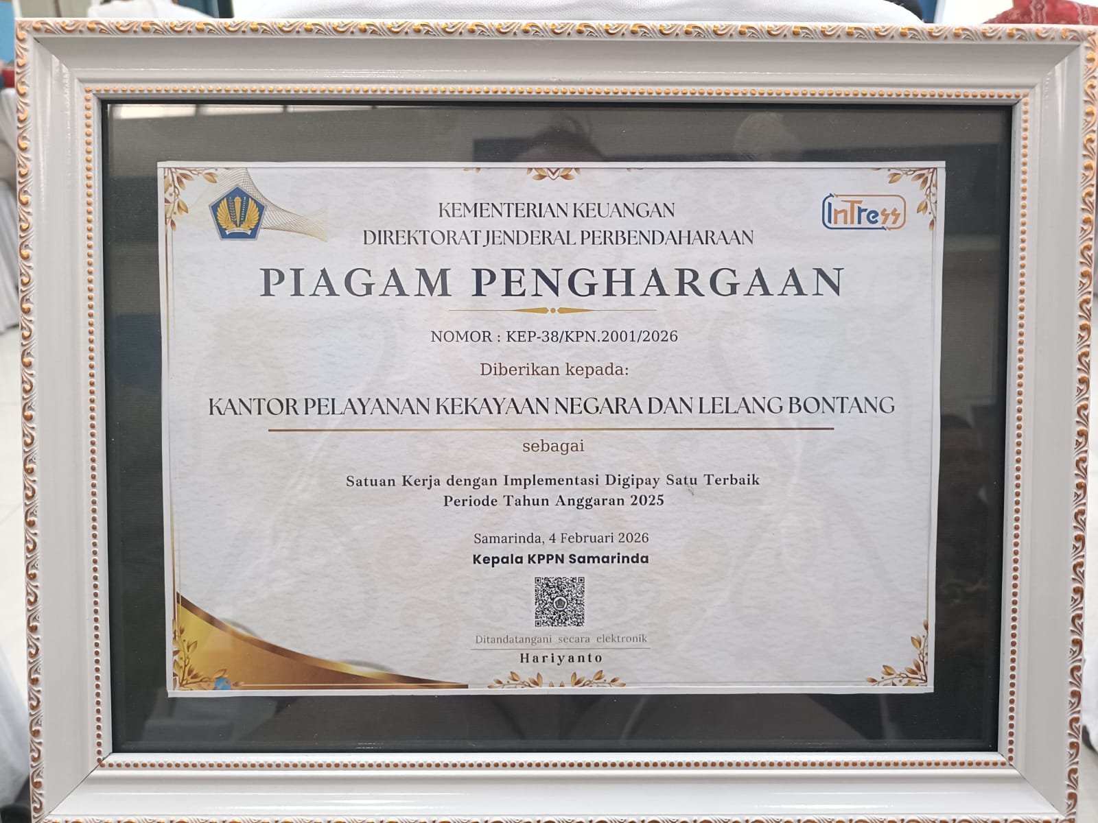 Penghargaan diserahkan langsung oleh Kepala Kantor Wilayah Direktorat Jenderal Perbendaharaan (DJPb) Kalimantan Timur dan Utara, sebagai bentuk apresiasi atas kinerja optimal satuan kerja dalam pengelolaan anggaran negara. Dalam kesempatan tersebut, KPKNL Bontang diwakili oleh Kuasa Pengguna Anggaran, Bapak Anas Waskita Jati.