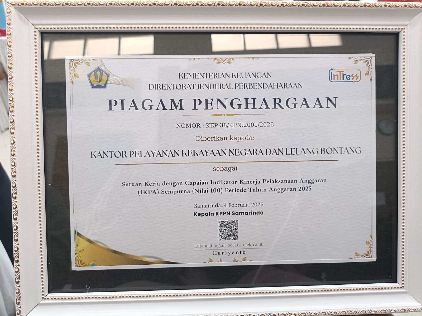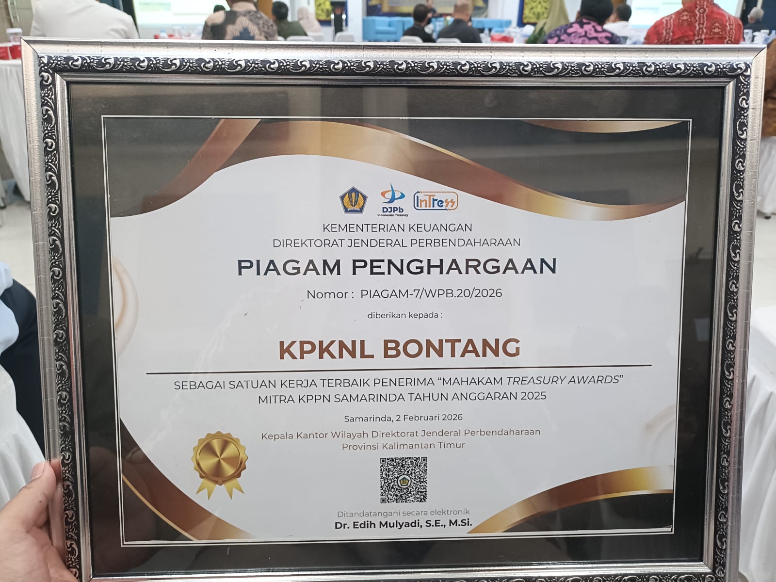 Sebagai penerima penghargaan Satuan Kerja Terbaik Penerima Mahakam Treasury Awards, KPKNL Bontang sebagai satker mitra KPPN Samarinda selaku Kuasa Pengguna Anggaran dinilai terbaik dalam pengelolaan Anggaran Pendapatan dan Belanja Negara Tahun 2025.