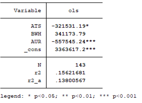 Koefisien determinasi yang dinyatakan dalam simbol adjusted r squared merupakan alat ukur goodness of fit dari persamaan yang dihasilkan oleh analisis regresi (Bintang, 2019). Koefisien determinasi pada tabel menunjukkan bahwa 13persen proporsi dari nilai tanah dari transaksi jual beli di Kota Bukittinggi dapat dijelaskan oleh ketiga variabel bebasnya, yaitu lokasi berupa jarak tanah ke Pasar Atas, lokasi berupa jarak tanah ke Pasar Bawah, dan lokasi berupa jarak tanah ke Pasar Aur Kuning. Sedangkan proporsi 87persen lainnya dijelaskan oleh variabel lain di luar model.