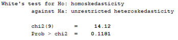 Pengujian lain yang dilakukan pada uji diagnostik ini adalah uji heteroskedasitas. Pengujian ini bertujuan untuk mengetahui apakah terdapat varians error yang tidak berubah (konstan) seiring dengan perubahan nilai variabel independen (Maulana, 2018). Uji yang digunakan untuk mengetahui adanya heteroskedasitas adalah uji White dan Breusch-Pagan/Cook-Weisberg test dan hasilnya adalah sebagai berikut.