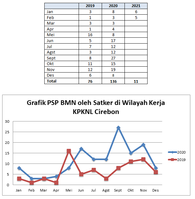 Pada Tahun 2021 bulan Januari dan Februari jumlah persetujuan PSP keseluruhan yang sudah diterbitkan KPKNL Cirebon berjumah 11 persetujuan yang menurut hemat kami hal ini masih sesuai dengan tren pada tahun-tahun sebelumnya yang cenderung rendah pada triwulan I. tetapi hal ini harus menjadi perhatian dikarenakan harus secepat mungkin menemukan tindakan-tindakan yang dapat meningkatkan tingkat persetujuan PSP sebagaimana tren tahun sebelumnya.