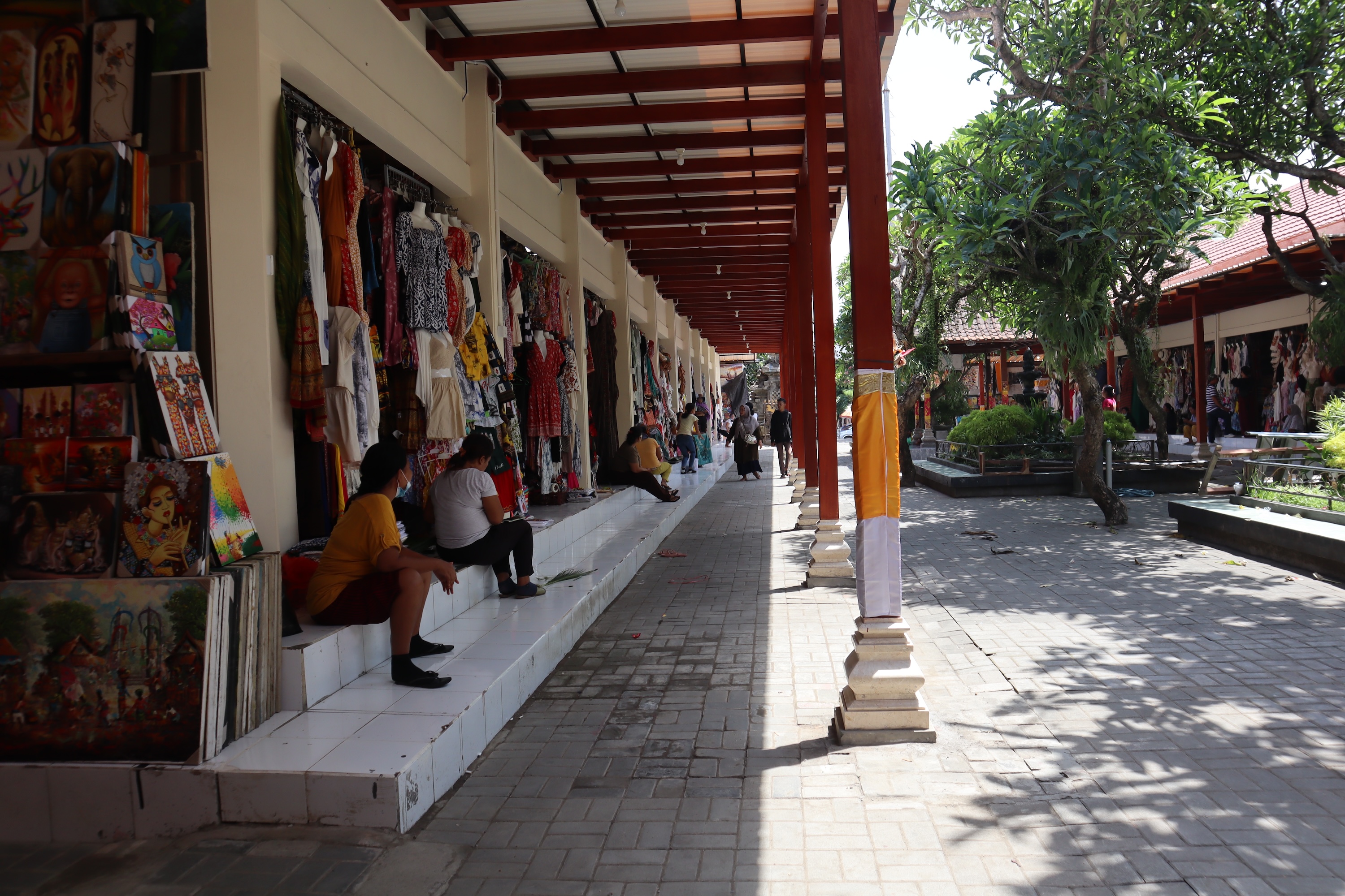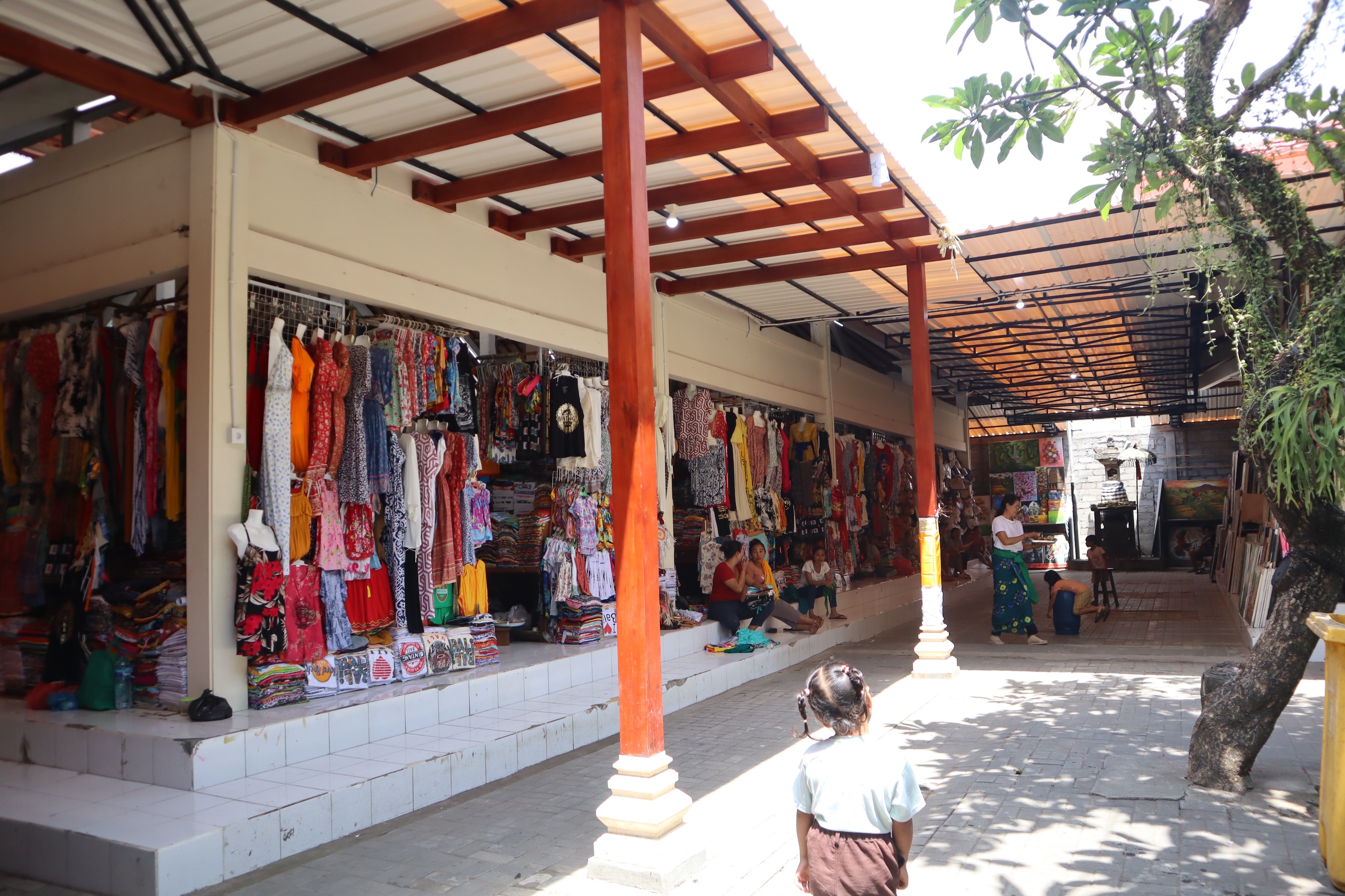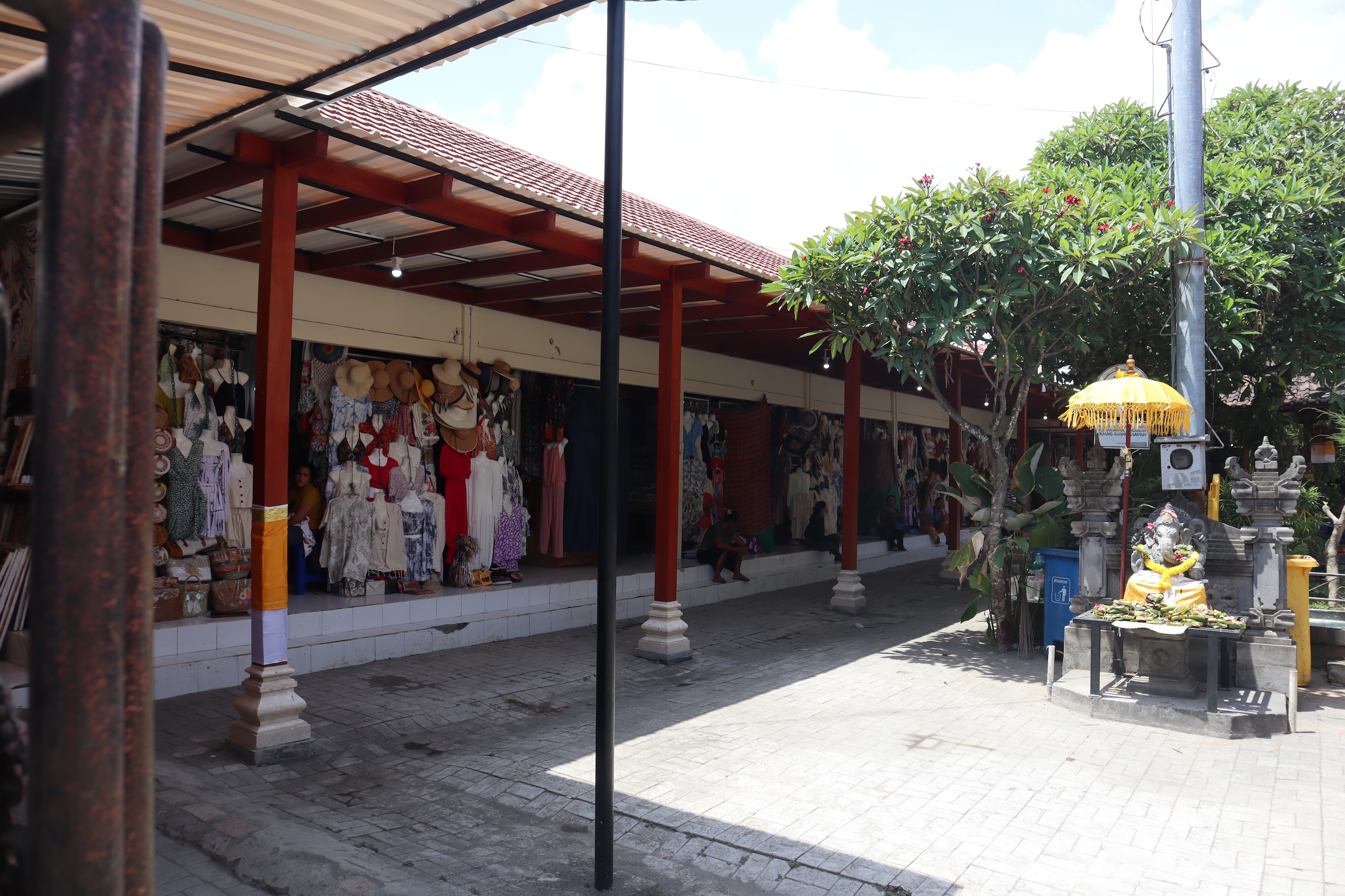 Pohon kamboja yang rindang juga menjadi daya tarik tersendiri di Pasar Seni Guwang, menciptakan lingkungan yang sejuk dan nyaman bagi para pengunjung. Bunga kamboja, yang sering kali diidentifikasi sebagai lambang identitas orang Bali, memberikan sentuhan keindahan pada pasar ini.