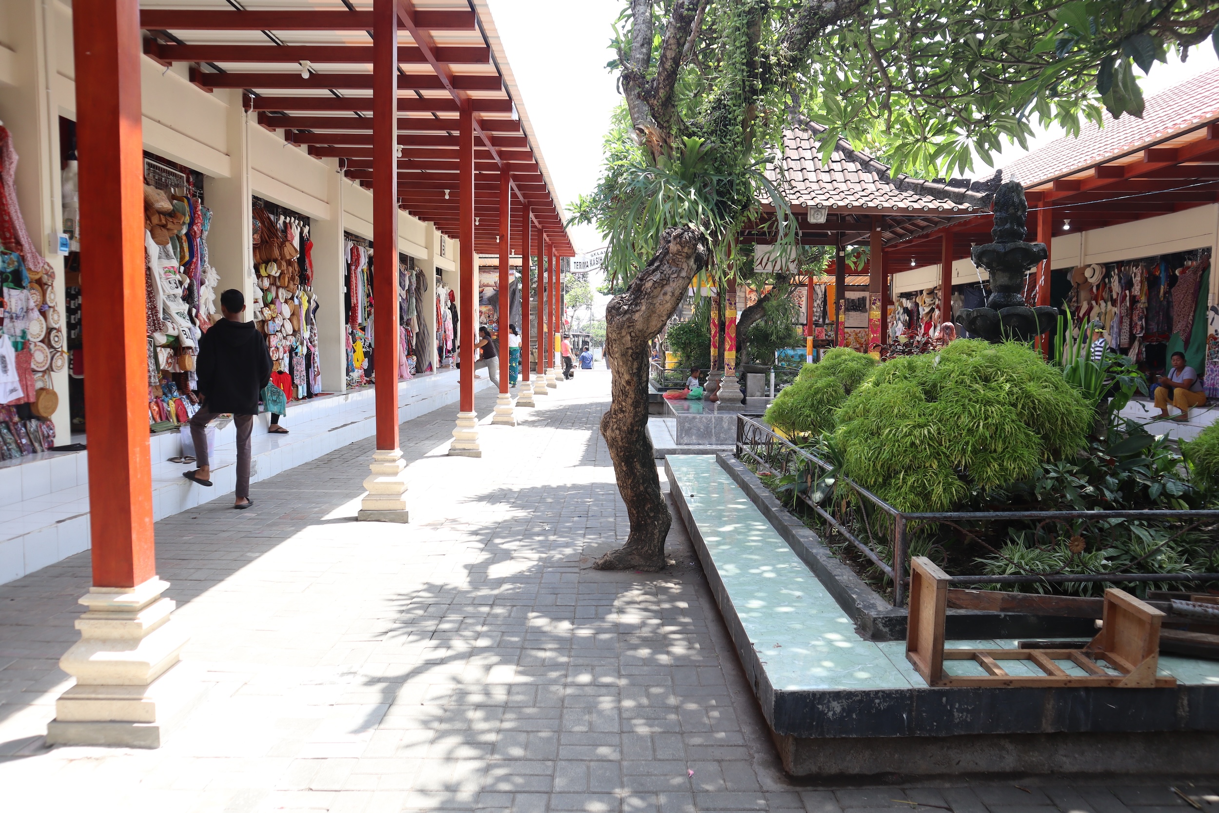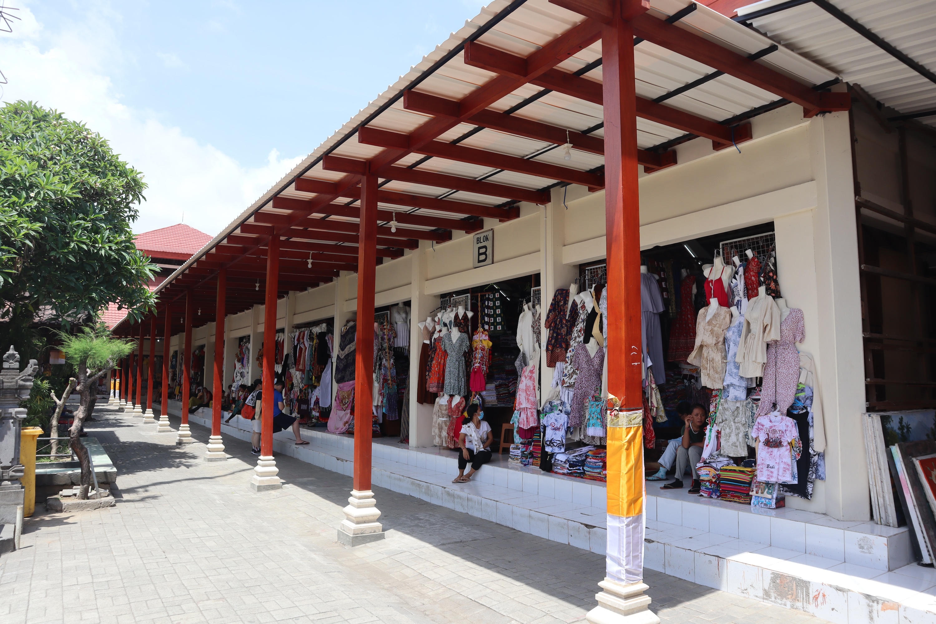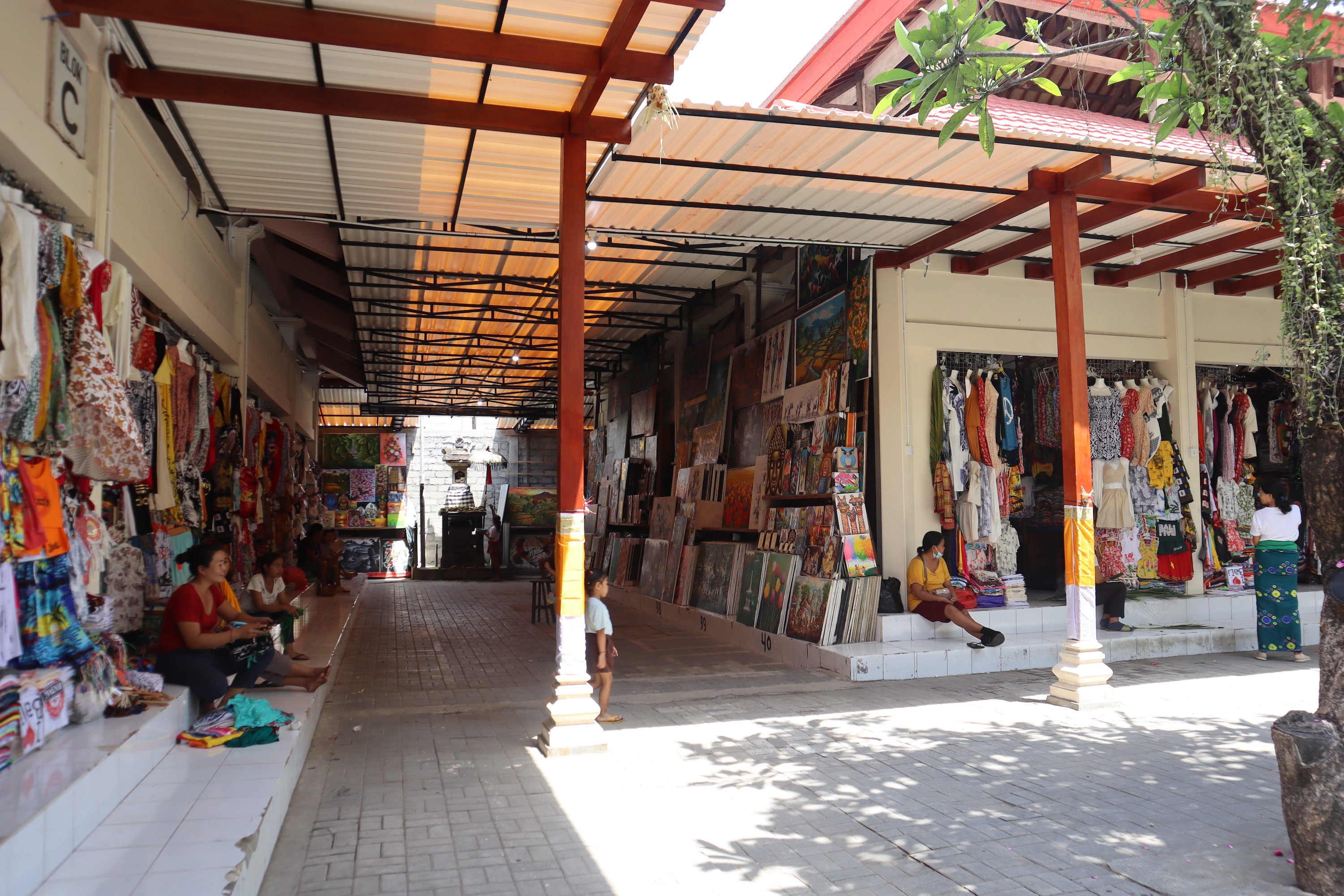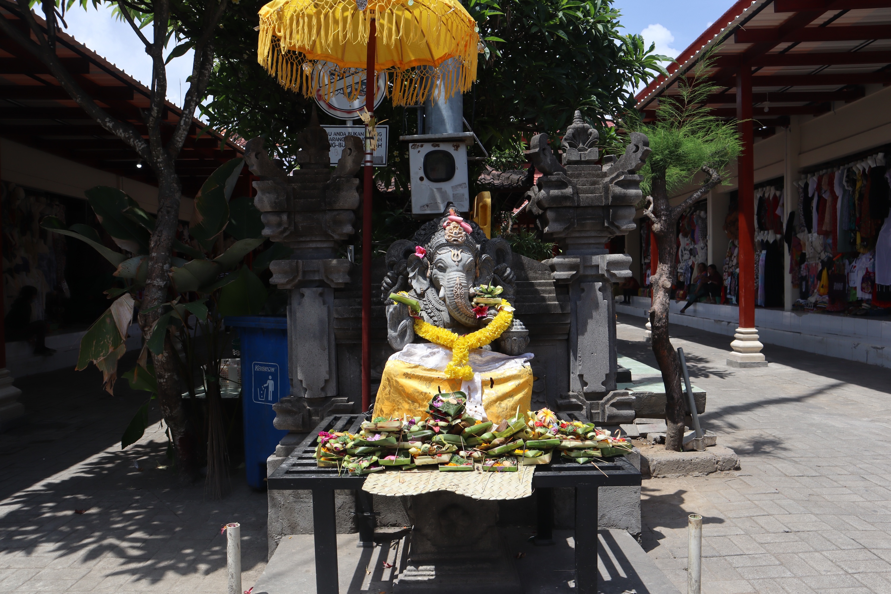 Pohon kamboja yang rindang juga menjadi daya tarik tersendiri di Pasar Seni Guwang, menciptakan lingkungan yang sejuk dan nyaman bagi para pengunjung. Bunga kamboja, yang sering kali diidentifikasi sebagai lambang identitas orang Bali, memberikan sentuhan keindahan pada pasar ini.