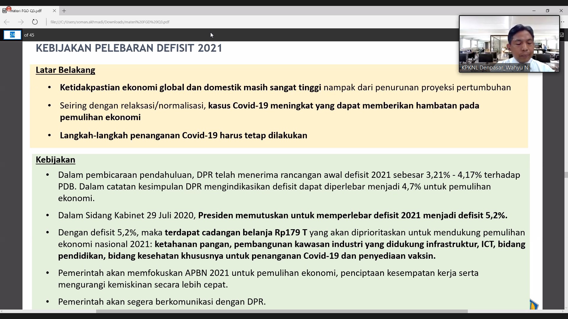Melihat kondisi ini, lebih dari 196 negara di dunia mengeluarkan stimulus, dengan total lebih dari US$8 triliun (10 persen PDB dunia). Koordinasi pemerintah RI dan Bank Indonesia dalam kebijakan Burden Sharing juga dilakukan demi mendorong keberlangsungan fiskal yang sehat dan kepastian pendanaan Pemulihan Ekonomi Nasional (PEN) dalam masa pandemi. Wahyu juga menjelaskan, pertumbuhan ekonomi di tahun 2021 diproyeksi tumbuh sebesar 4,5%-5,5%, dipengaruhi oleh faktor Covid-19, reformasi struktural, dan ekspansi fiskal. Kebijakan fiskal akan diarahkan untuk mendukung percepatan pemulihan ekonomi nasional dan penguatan reformasi, pelebaran defisit untuk percepatan penanganan Covid-19 serta stimulus ekonomi. Menurutnya, penemuan vaksin yang masih berlangsung menjadi salah satu keberhasilan dalam penanganan Covid-19 sekaligus menjadi faktor utama penentu pertumbuhan ekonomi di tahun 2021. Sampai saat ini, asumsi pertumbuhan ekonomi ditunggu. Banyak faktor yang mempengaruhi selama pandemi sehingga memunculkan ketidakpastian. Beliau menyampaikan, sesuai dengan data kenaikan/penurunan pandemi, ditemukan vaksin, dan penanganan lainnya, proyeksi optimis dan positif kedepannya kemungkinan dapat dicapai.