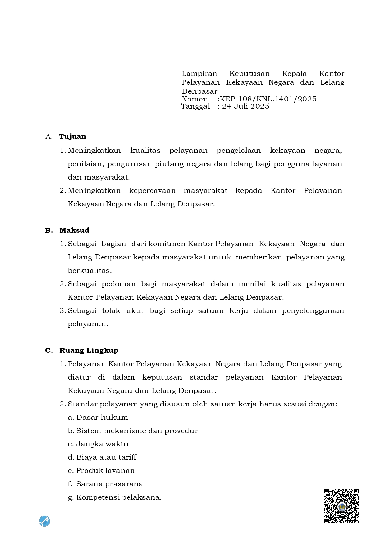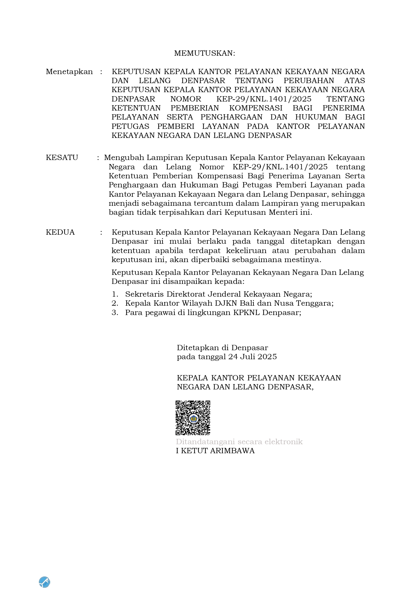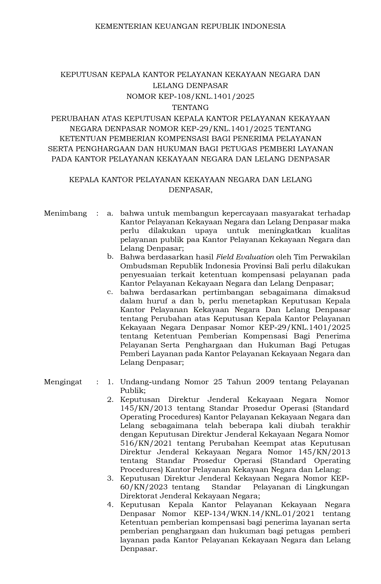 KEP-108/KNL.1401/2025 Tentang Perubahan Pemberian Kompensasi Pada Kantor Pelayanan Kekayaan Negara Dan Lelang Denpasar Tahun 2025