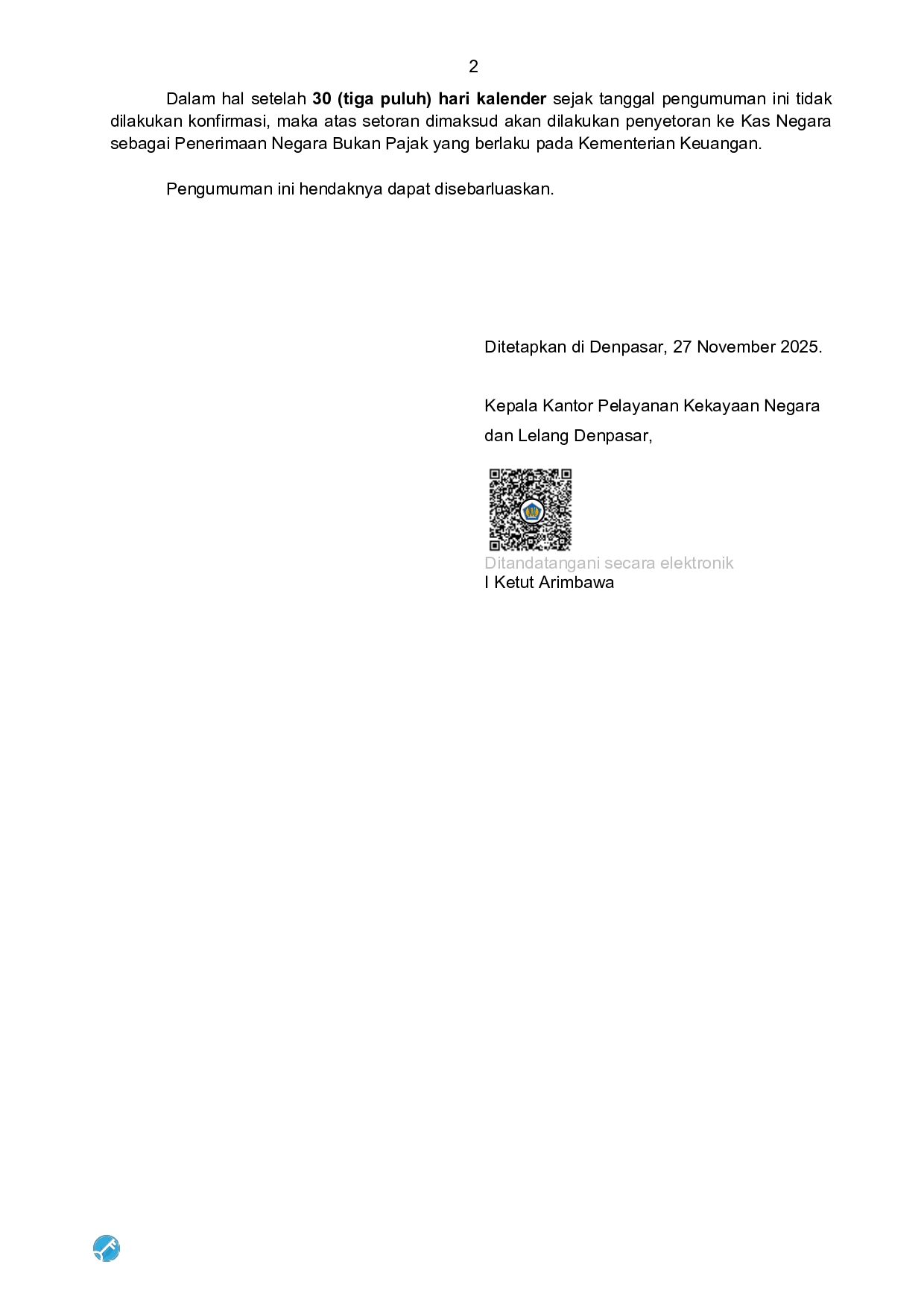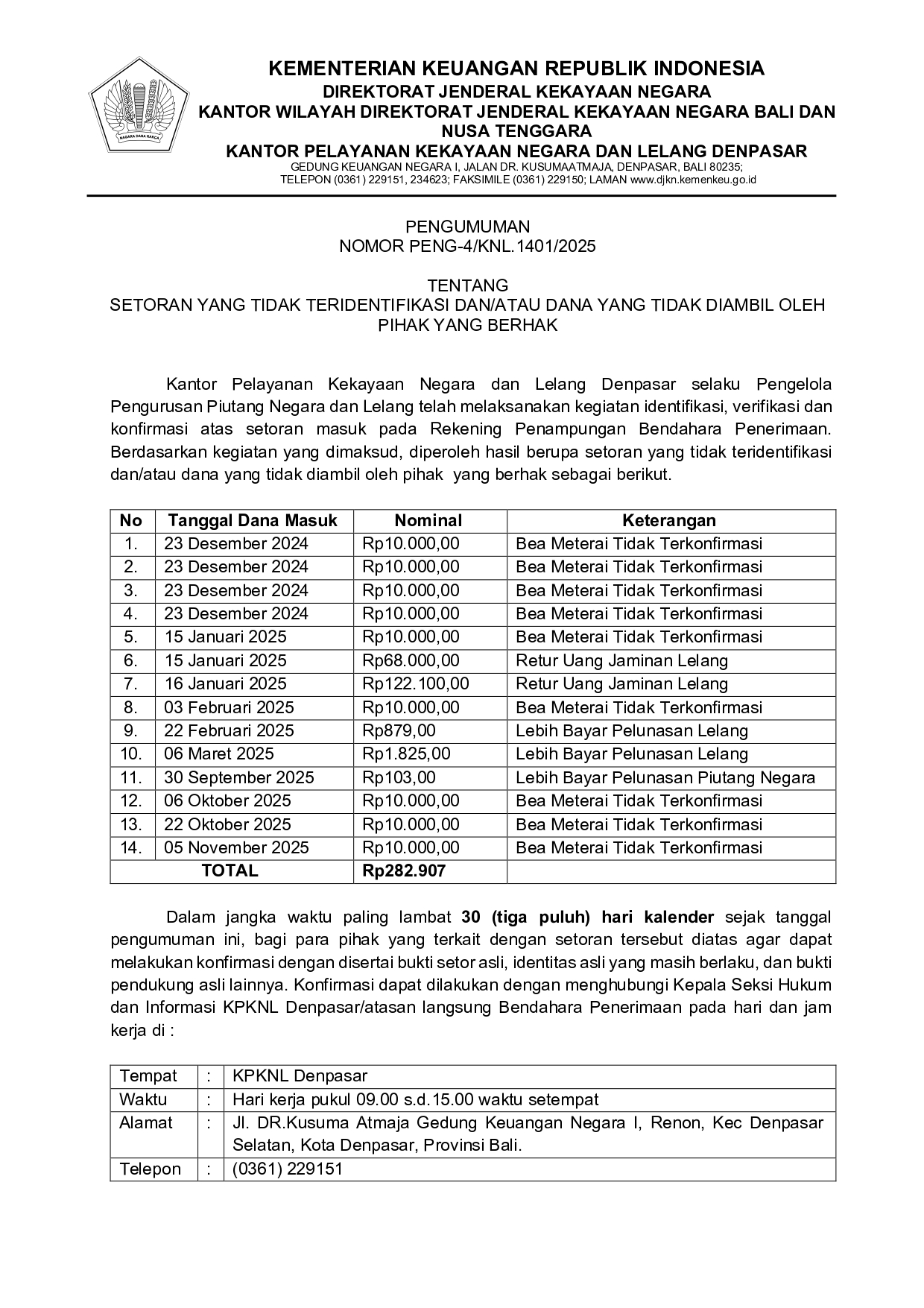 PENG-4/KNL.1401/2025 Tentang Setoran Yang Tidak Teridentifikasi Dan/Atau Dana Yang Tidak Diambil Oleh Pihak Yang Berhak