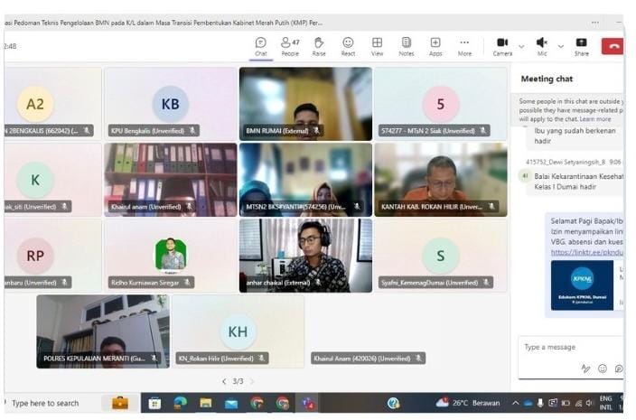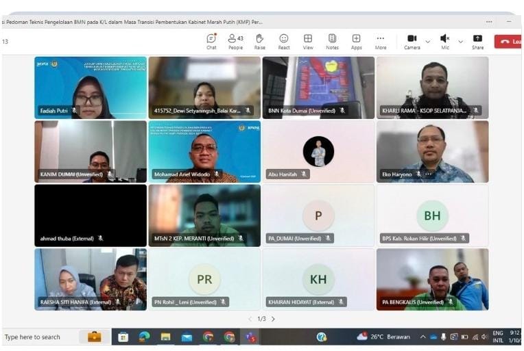 Pada Jumat, 10 Januari 2025 KPKNL Dumai menyelenggarakan acara Sosialisasi Pedoman Teknis Pengelolaan Barang Milik Negara (BMN) Kementerian/Lembaga (K/L) Dalam Masa Transisi Pembentukan Kabinet Merah Putih (KMP) Periode 2024-2029. Kegiatan sosialisasi dilaksanakan secara daring melaui media ms.teams dan diikuti oleh seluruh peserta dari perwakilan satuan kerja di lingkungan wilayah kerja KPKNL Dumai.