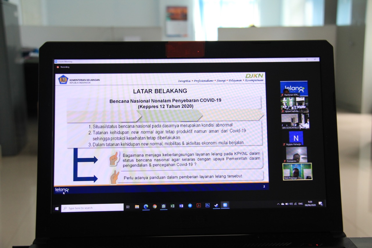 Gorontalo, 08 Juni 2020, Seksi Pelayanan Lelang KPKNL Gorontalo mengadakan sosialisasi terkait Peraturan Direktur Jenderal Kekayaan Negara Nomor 5/KN/2020 tentang Panduan Pemberian Layanan Lelang pada KPKNL Dalam Status Bencana Nasional Non Alam Penyebaran Corona Virus Disease 2019 (COVID-19) secara virtual melalui konferensi video. Acara ini diikuti oleh Kepala KPKNL Gorontalo, Pimpinan Bank dan perwakilan Bank di wilayah Provinsi Gorontalo serta pegawai KPKNL Gorontalo. Kepala Bidang Lelang Kantor Wilayah DJKN Suluttenggomalut menjadi Narasumber dalam sosialisasi ini.