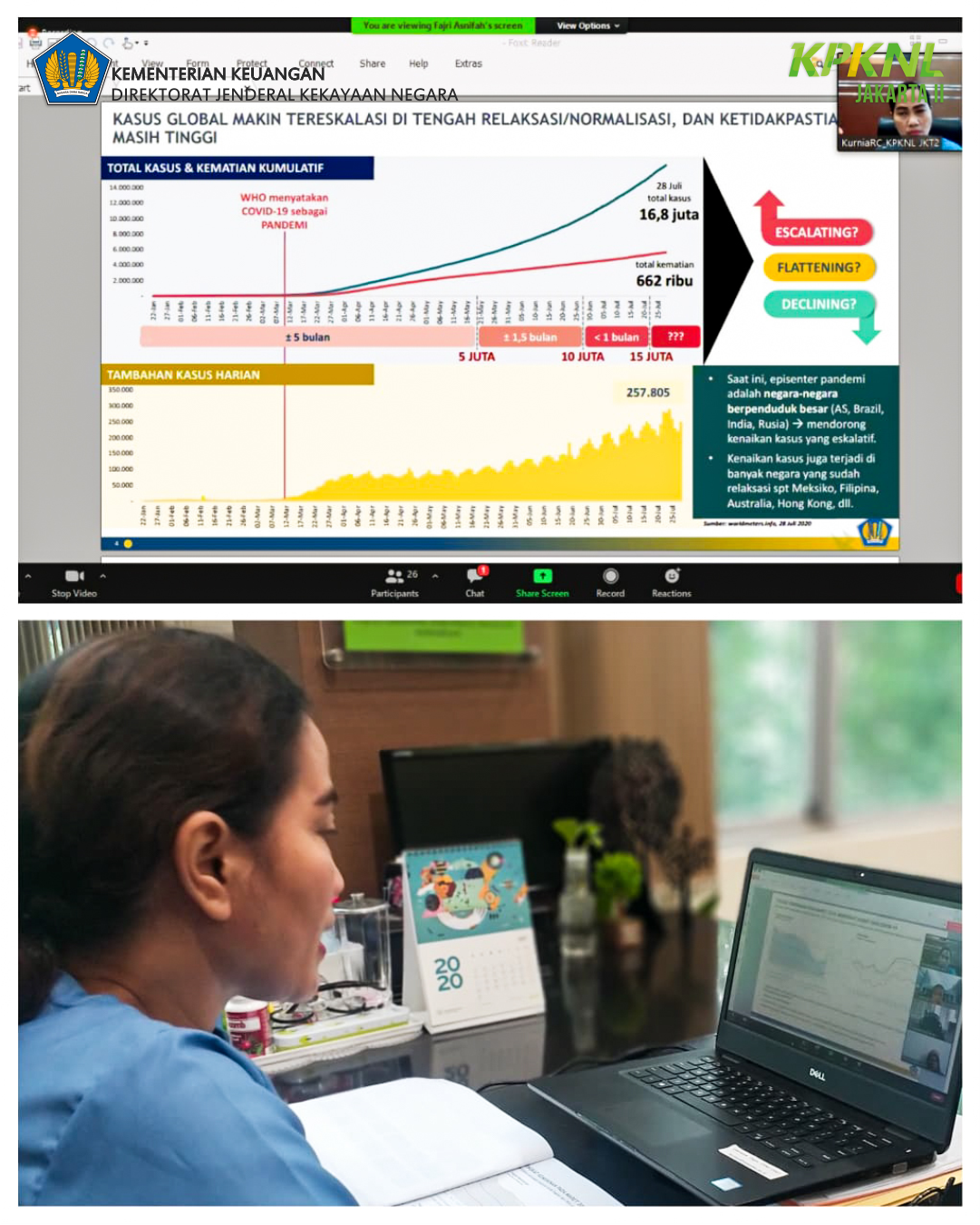 Pada hari Rabu 16 September 2020, KPKNL Jakarta II melaksanakan FGD Pejabat Administrator Triwulan III Tahun 2020 dengan topik "Kebijakan Defisit Aset Anggaran Pemerintah" melalui aplikasi online meeting. Topik pembahasan dalam dikusi tersebut adalah Kondisi dan dampak yang dirasakan Indonesia dari segi Ekonomi karena pandemi Covid-19. Beberapa contoh dari dampak pandemi Covid-19 pada perekonomian Indonesia adalah melambatnya pertumbuhan ekonomi sebesar 2.97% pada triwulan 1 tahun 2020 dan meningkatknya tingkat kemiskinan terutama di pulau Jawa sebesar 0.37 basis poin atau setara dengan 1.28 juta orang miskin baru. Namun pemerintah sudah mengambil langkah strategis dalam mengatasi ini semua seperti Realokasi Anggaran dengan penghematan sebesar Rp190 triliun dan realokasi anggaran belanja sebesar Rp55 triliun dan prioritas anggaran untuk penanganan Covid-19 melalui Pemda dan K/L. Selain realokasi anggaran, pemerintah juga memberikan stimulus-stimulus yang tujuannya untuk memperkuat ekonomi domestik, stimulus ini terbagi menjadi 3 (tiga) tahap yaitu Stimulus I sebesar Rp8,5 triliun untuk memperkuat ekonomi domestik melalui belanja pemerintah, Stimulus II sebesar Rp22,5 triliun untuk menjaga daya beli masyarakat, memberi kemudahan ekspor dan impor, sedangkan Stimulus III sebesar Rp405,1 triliun untuk dukungan kesehatan, pemberian bantuan tunai bagi masyarakat kurang mampu, dan dukungan bagi perusahaan berdampak. Selain itu terdapat juga penambahan biaya sebesar Rp695,2 triliun yang dialokasikan untuk kesehatan sebesar Rp87,66 triliun dan pemulihan ekonomi nasional sebesar Rp607,65 triliun. Selain Realokasi Anggaran dan Stimulus, pemerintah juga membuat kebijakan terkait moneter dan keuangan, di bagian moneter, pemerintah memberlakukan kebijakan penurunan tingkat suku bunga acuan BI, menurunkan Giro Wajib Minimum (GMW, baik untuk Rupiah maupun mata uang asing, memperpanjang tenor Surat Berharga Negara (SBN) dan menyediakan uang higienis. Sedangkan dari sisi keuangan, pemerintah memberlakukan pelonggaran persyaratan kredit/pembiayaan/pendanaan bagi UMKM, dan memberikan keringan pembayaran kredit bagi UMKM.